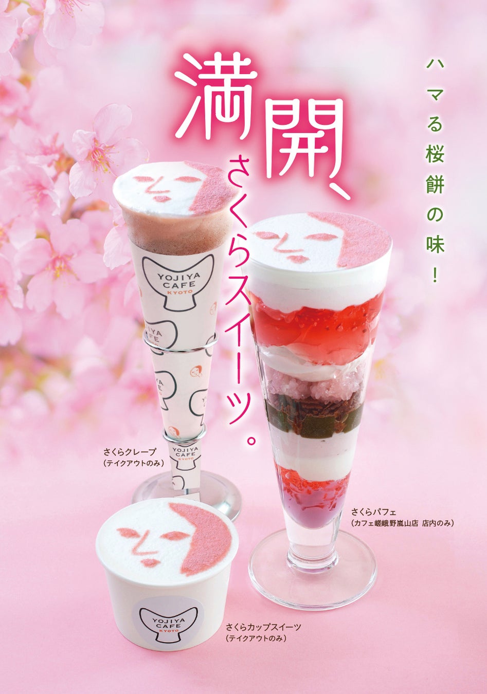 よーじやカフェでは4月1日(土)より「さくらパフェ」「さくらクレープ」「さくらカップスイーツ」を販売開始いたします。