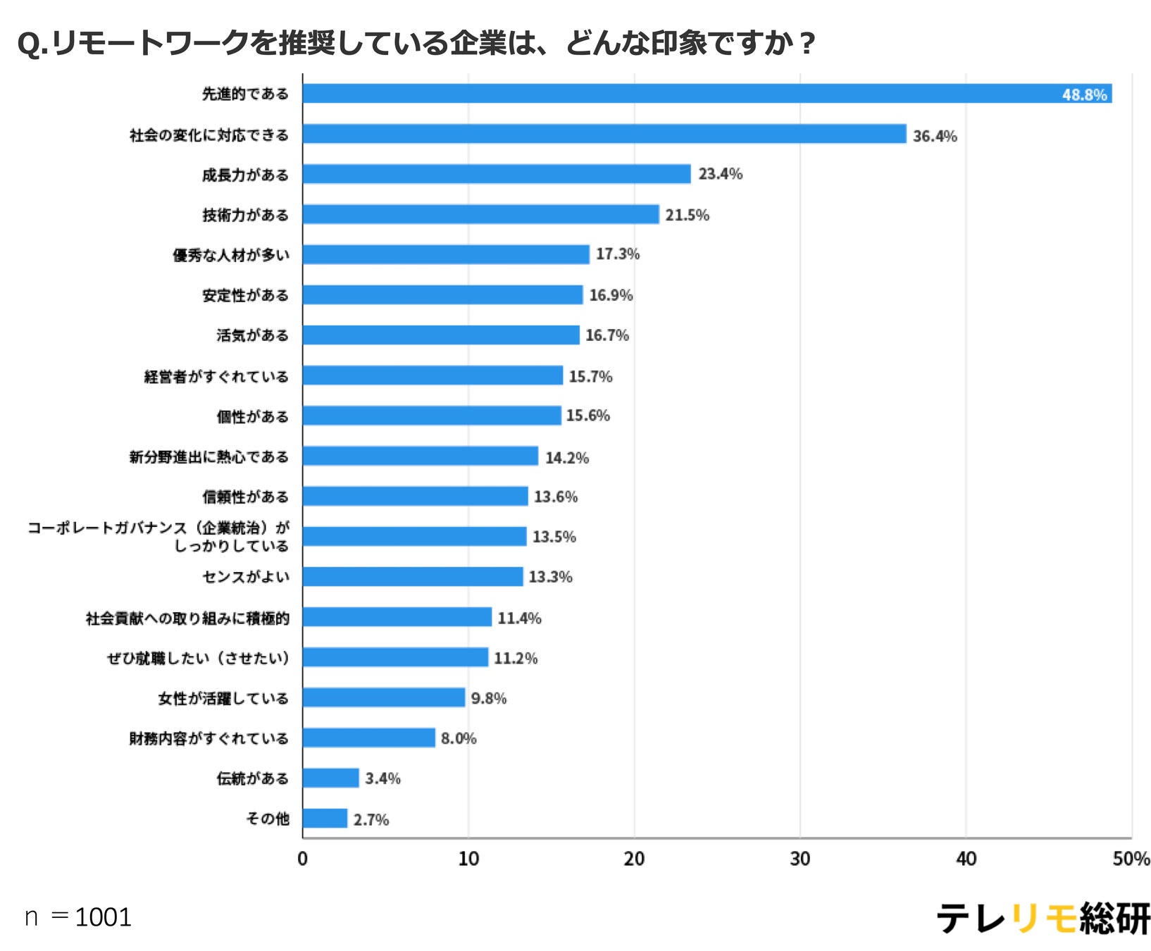 結果を見てみると、全体の半数近く、実に48.8%もの人が「リモートワークを推奨している企業は先進的である」という印象を持っているようです。