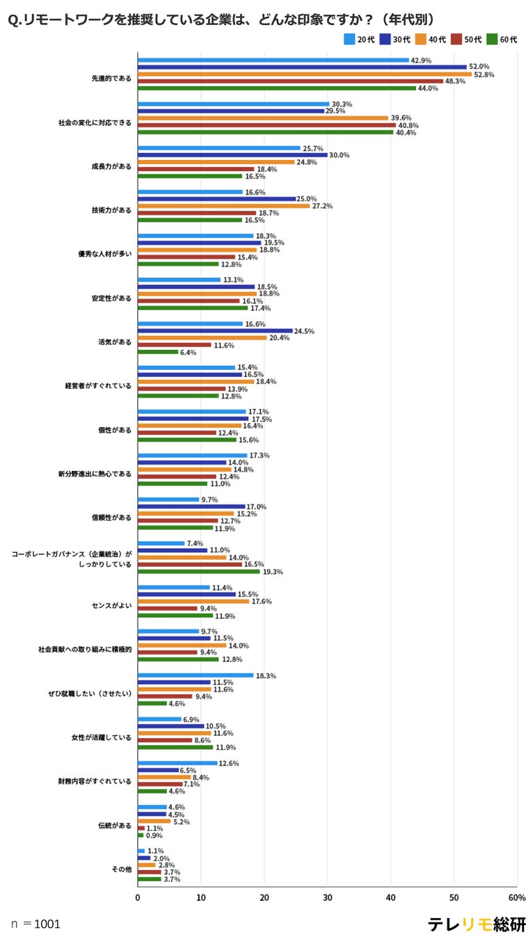 リモートワーク導入企業に対して「先進的である」という印象を持っている人は、全ての年代を通して40~50%程度いることがわかります。