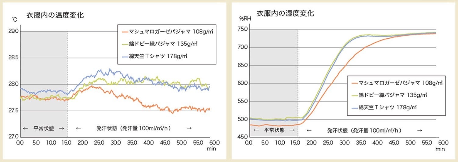就寝中に「ムレ感」や「ベタつき」によって目が覚めてしまった・・・という経験がある方は多いのではないでしょうか。この「ムレ感」や「ベタつき」の要因となりえるのは、肌とパジャマの間の温度と湿度。下記のデータは、異なる3種類の素材を使用し、発汗状態の衣服内の温度と湿度を計測した結果です。このようにマシュマロガーゼは、他素材よりも温度と湿度の上昇が抑えられ、心地よい睡眠をサポートしていることが分かりました。