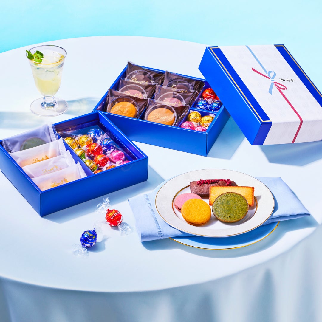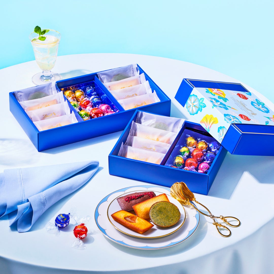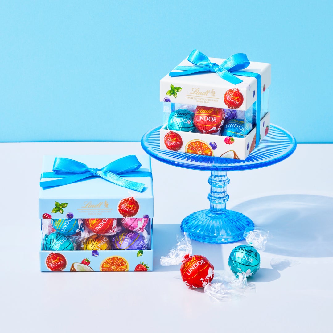 定番フレーバーに加え、夏限定の「ブルーベリー&クリーム」「ココナッツ」のリンドールを詰め合わせたギフトボックス。夏を感じる華やかなパッケージはインパクトもあり、久々に再会する相手に贈るギフトにはピッタリです。