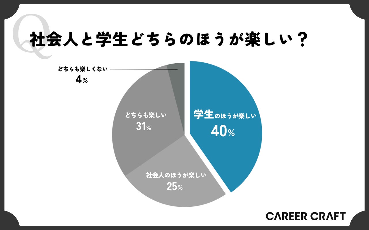 「社会人と学生、どちらが楽しかったですか?」と聞いたところ、「学生時代のほうが楽しかった」と答えた人が全体の40%を占め、最多となりました。
