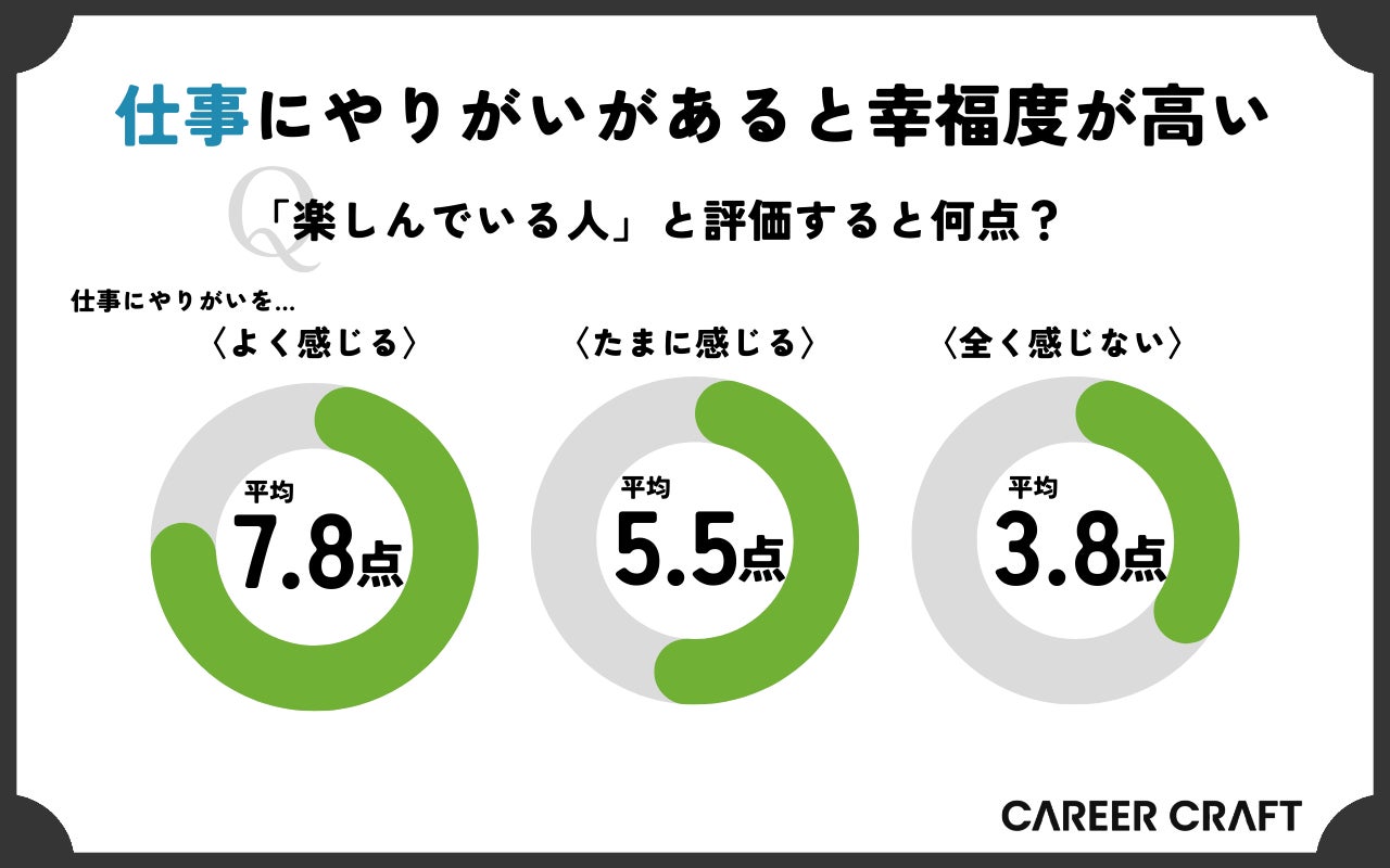 今の自分を「楽しんでいる人」として10点満点で評価してもらうと、仕事にやりがいを感じている人は平均7.8点、全く感じていない人は平均3.8点と大きな差があった。