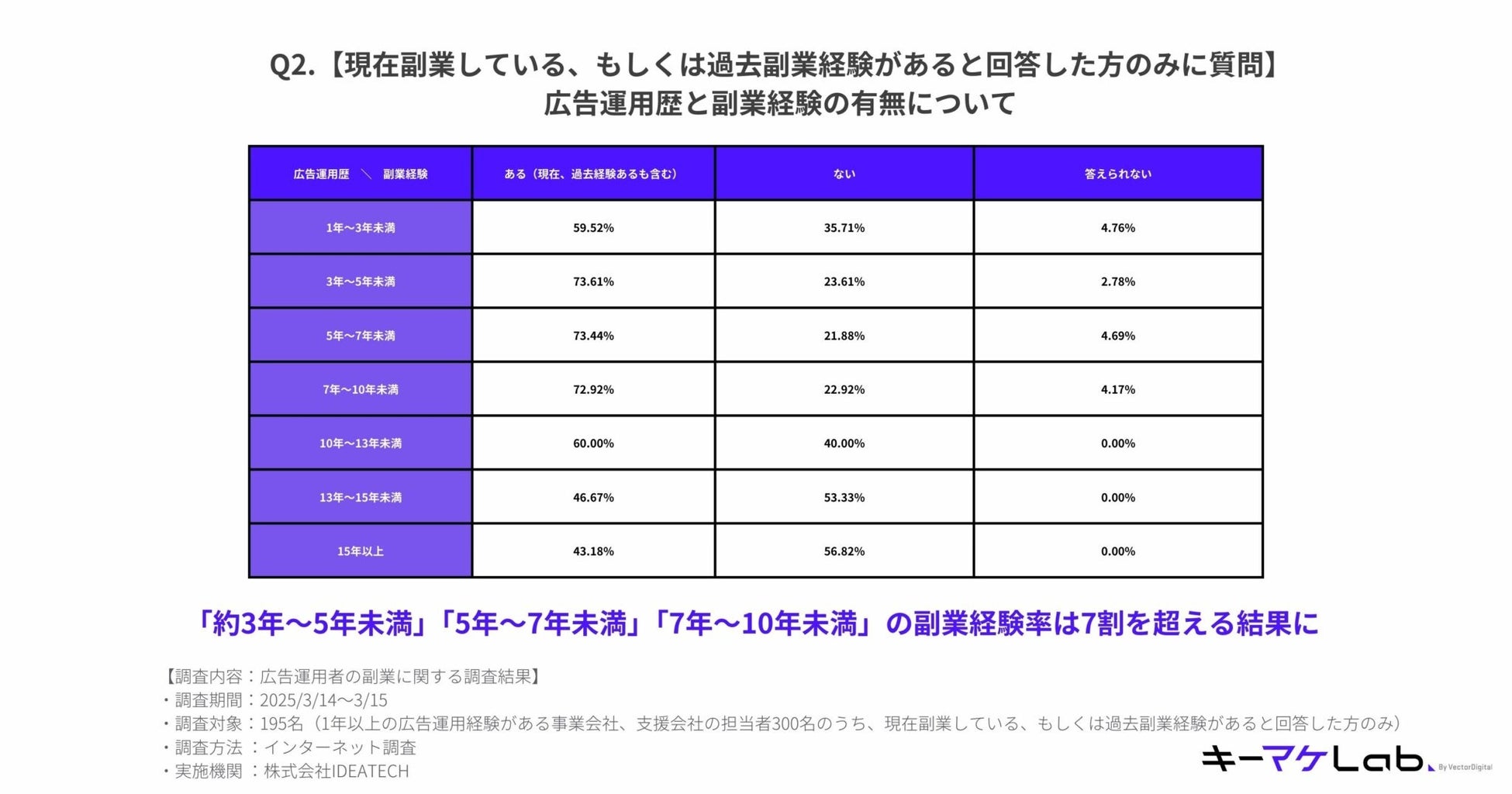 広告運用歴3年〜5年未満、5年〜7年未満、7年〜10年未満に関しては、副業経験者が7割を超える結果に。