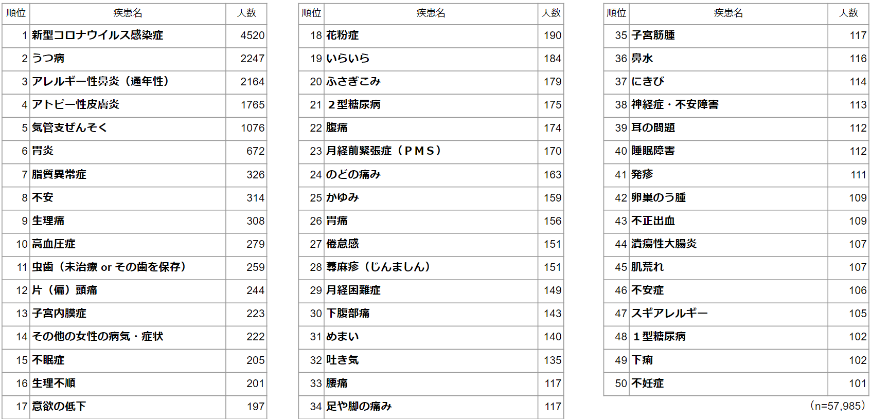 〈図3-2〉1年以内に入通院した疾患で最も多くあげられたのは新型コロナウイルスで、女性で約7.8%(4,520人)であった