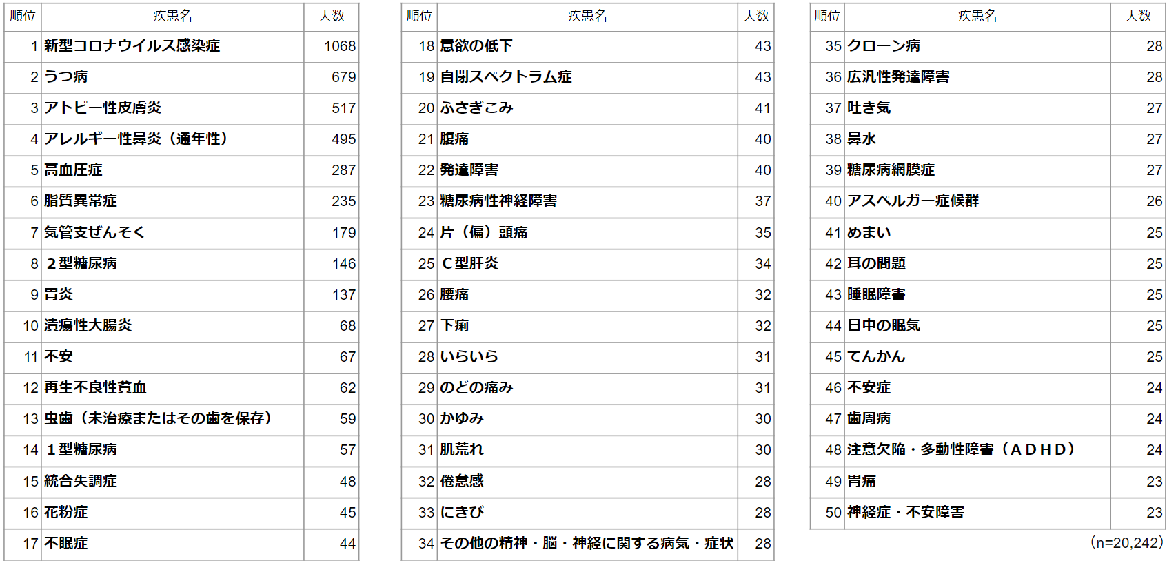 〈図3-1〉1年以内に入通院した疾患で最も多くあげられたのは新型コロナウイルスで、男性で約5.3%(1,068人)