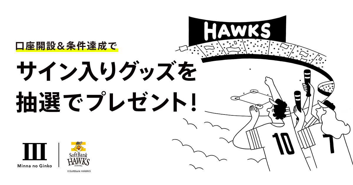 | 対象者 | 下記a~dを全て満たした方が対象となります a.開催期間中に、新規にみんなの銀行の預金口座を開設した方 b.開催期間中に、みんなの銀行の普通預金口座に10万円以上入金した方 c.2023年3月31日23時59分時点の「ホークス応援」Box残高が10万円以上ある方 d.特設サイト内の応募フォームからご応募いただいた方 ※「ホークス応援」Boxについての詳細は、特設サイトよりご確認ください |
