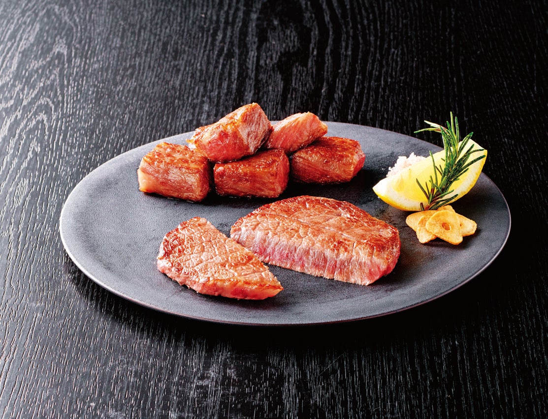 肉のしっかりとした食感がありつつも、美しいサシが特徴の赤身と角切りのステーキをお楽しみいただけます。