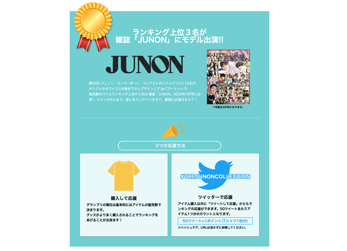 丸井織物株式会社の運営するオリジナルT シャツ作成サービス「Up-T」と主婦と生活社発行のJUNON(毎月22日発売)によるタイアップ企画として、2021年に開催された第34回 ジュノン・スーパーボーイ・コンテストのファイナリスト全15名によるJUNON9月号(7/22発売)誌面のモデルデビューをかけた販売バトルを2022年2月14日(月)より開催中です。