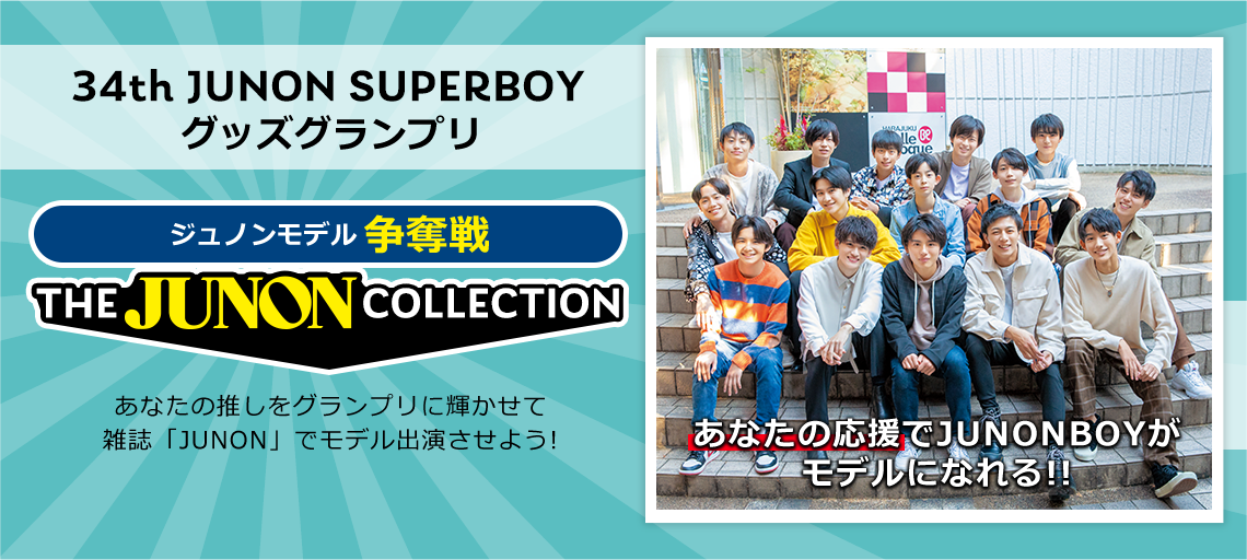 第34回 ジュノン・スーパーボーイ・コンテストのファイナリストの15名が雑誌「JUNON」のモデル出演をかけてオリジナルアイテムの販売ランキングバトルを繰り広げます。ファンはもちろん、次世代のスターのアイテムをゲットできるイベントとなっています。