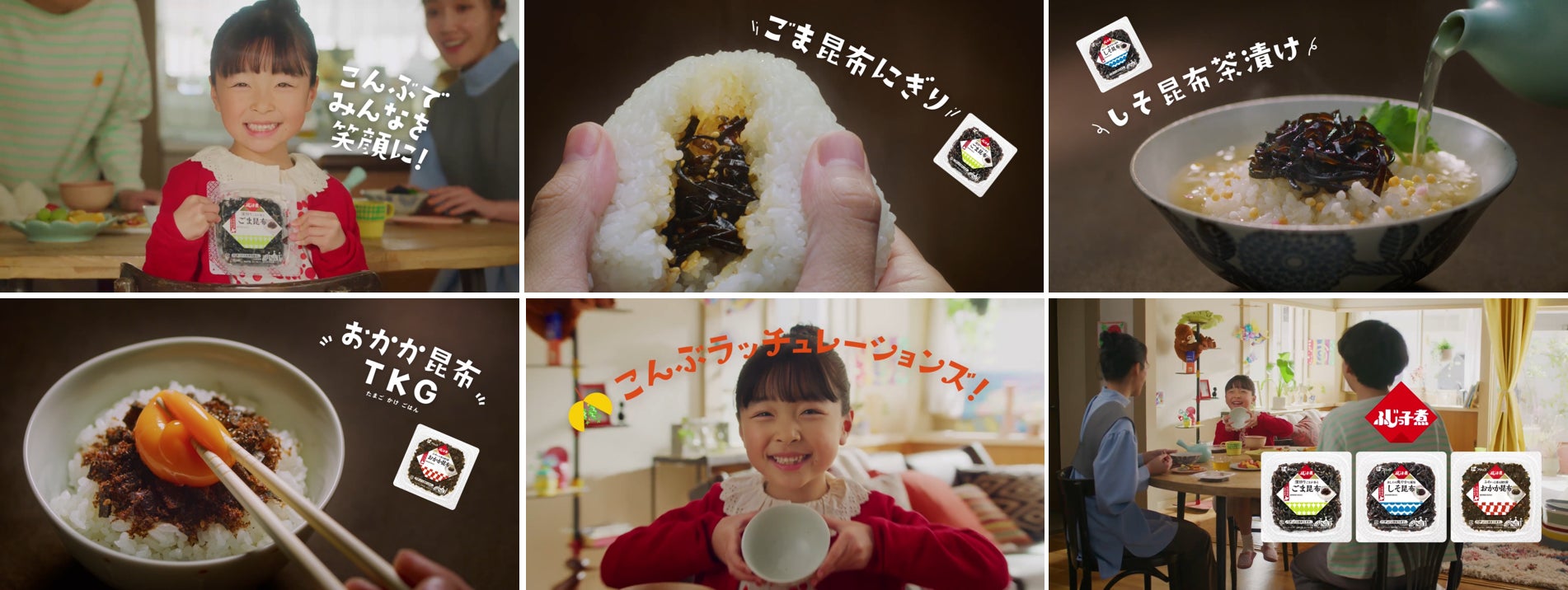 CMでは、3人家族が仲良く食卓を囲んでいる様子が描かれています。「こんぶでみんなを笑顔に!」というメッセージと共に、おにぎりやお茶漬け、TKG(たまごかけごはん)など「ふじっ子煮」シリーズの様々な食べ方をテンポよく訴求しています。長年ご家庭で愛されてきた「ふじっ子煮」シリーズのおいしさとごはんを完食した女の子のセリフ「おいしかった!」が印象的なCMとなっています。
