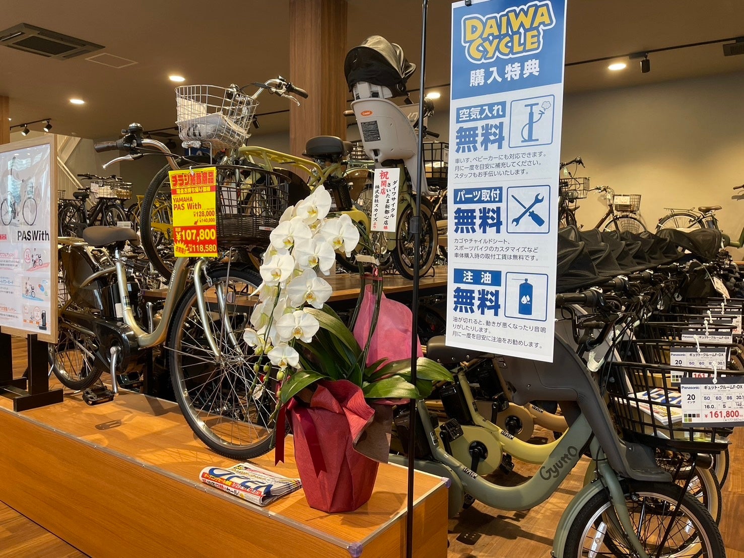 オープンを記念して、3月29日(金)から3月31日(日)までの3日間は超特価オープニングセールを実施いたします。特別価格として、日替わりで7,678円(税込)のファミリーサイクルや10,978円(税込)の6段変速付きファミリーサイクルを20台限定でご用意すると共に、各種電動アシスト自転車に関してはWebサイト(https://www.daiwa-cycle.co.jp/feature/open_saitamashintoshin)よりクーポンをご持参いただくと11,000円(税込)引で販売をさせていただきます。(クーポン利用については条件がございますので、クーポン券の注記をご確認の上ご利用願います。)