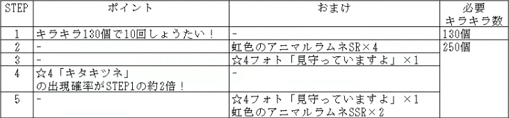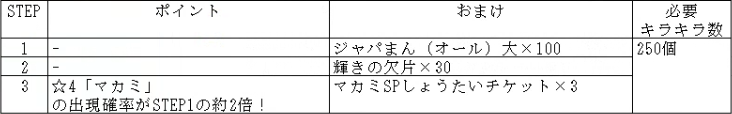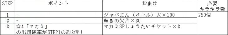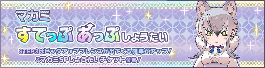 また、STEP3では☆4「マカミ」の確率がアップし、「マカミSPしょうたいチケット」×3が手に入ります。「マカミSPしょうたいチケット」を15枚集めると、☆4「マカミ」を必ずしょうたいできる「☆4マカミ確定!チケットしょうたい」が行えます。この機会をお見逃しなく!