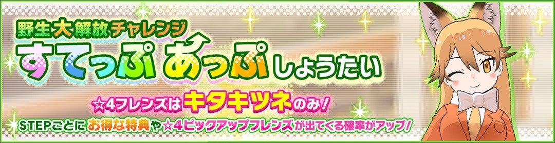 イベント「野生大解放チャレンジ キタキツネ編」では、野生解放5段階目が解禁されたフレンズに必要な野生解放素材を獲得することができます!今回の「野生大解放チャレンジ」の対象フレンズは☆4「キタキツネ」!野生解放5段階目まで強化し、フレンズのさらなる力を解放しましょう。