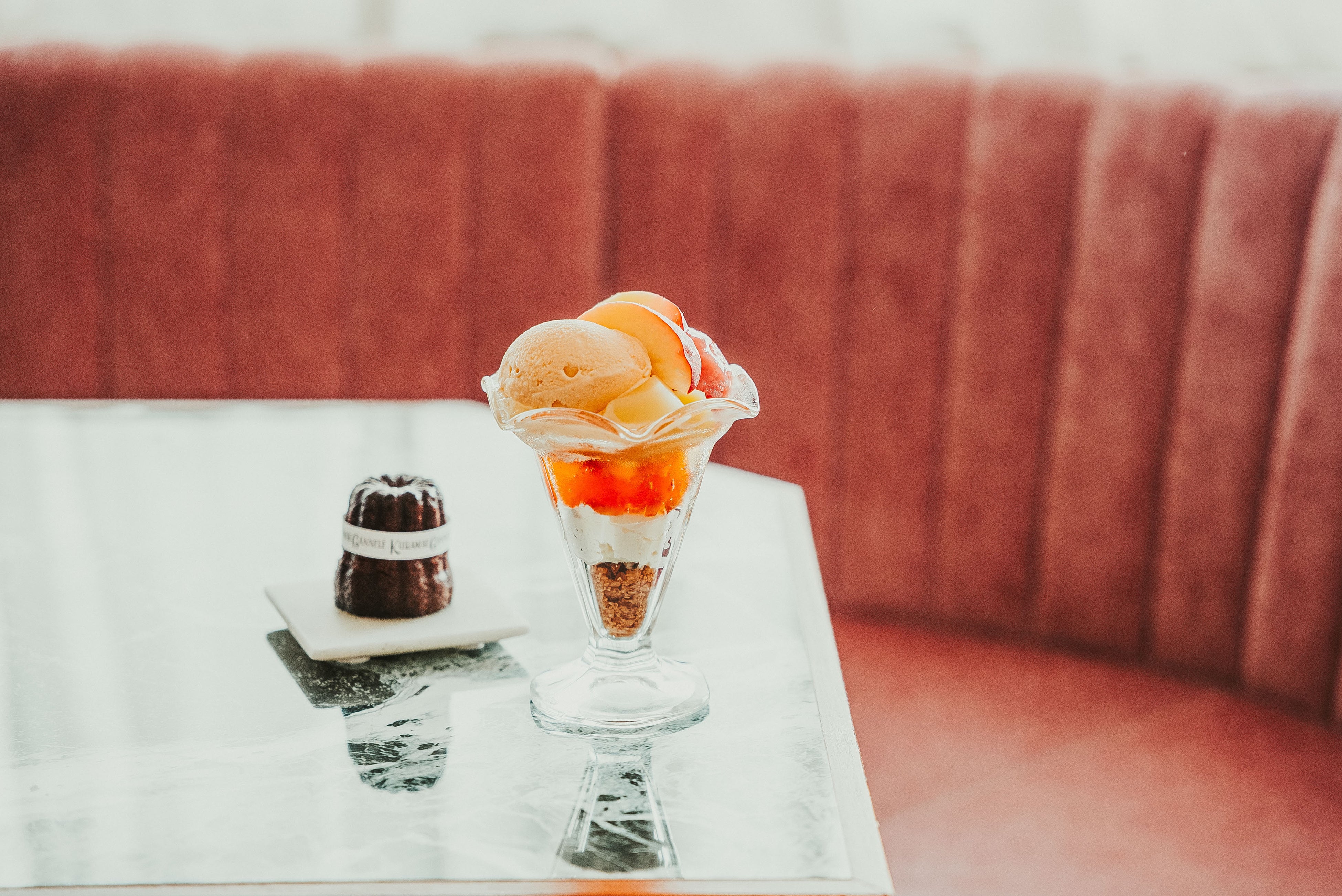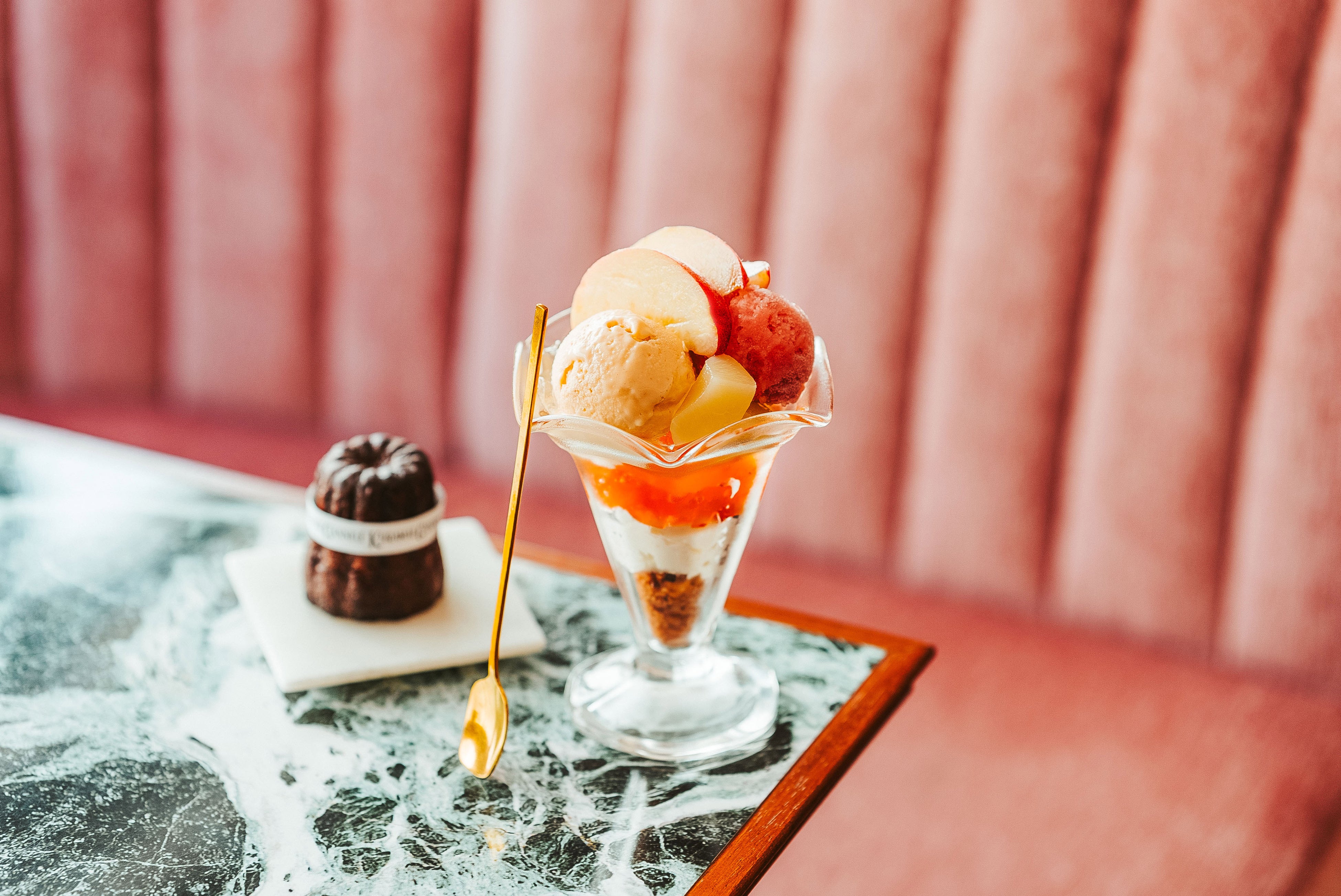 今年の「グランカヌレ&桃のパフェ」は、CANNELÉ CAFEの特別なカヌレ「グランカヌレ」にさらに合うよう、華やかな香りのするエルダーフラワーアイスを使用し、爽やかな桃との相性が抜群なパフェにバージョンアップ。夏限定の特別なパフェを蔵前でぜひお楽しみください。