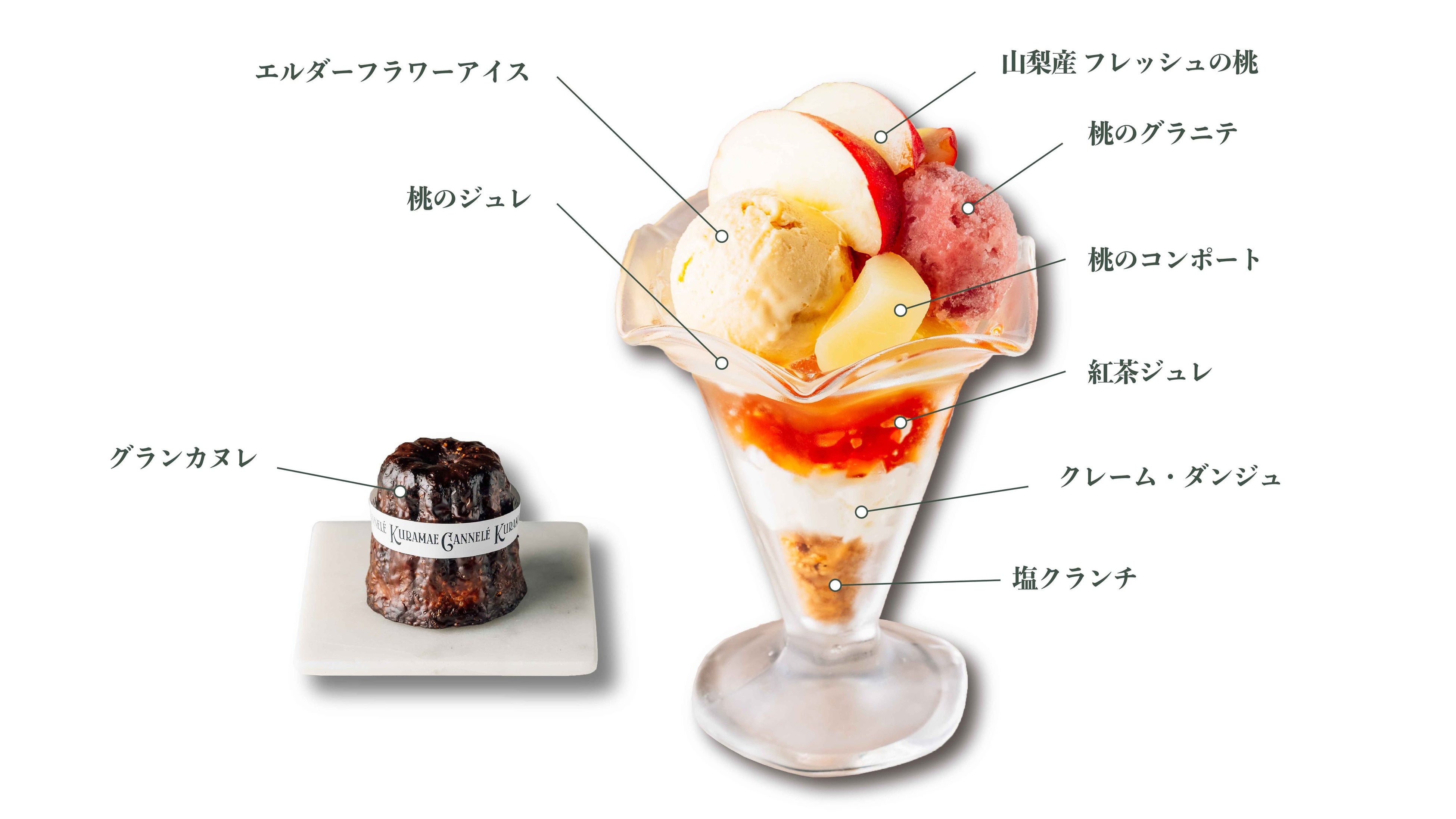 「グランカヌレ&桃のパフェ」は、KURAMAE CANNELÉ CAFEのプレミアムカヌレ「グランカヌレ」のために作られました。