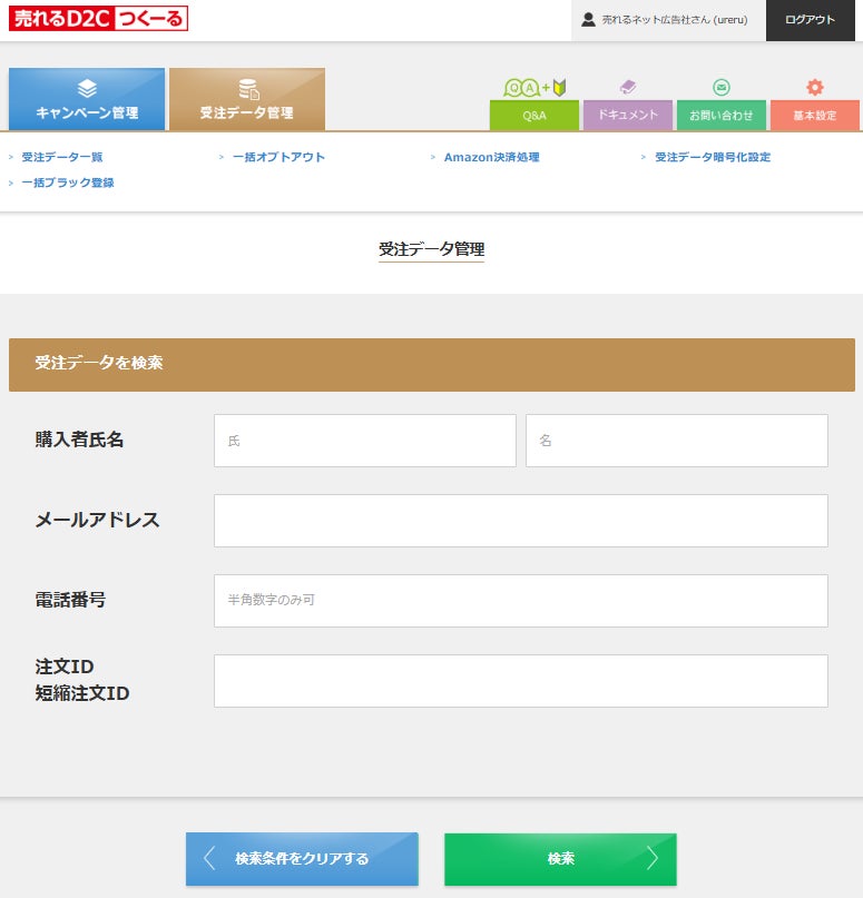 今回のバージョンアップでは、特に多くの要望をいただいていた「受注データ管理機能」を強化いたしました。従来の機能では、受注データの検索に制限がありましたが、今回のアップデートにより、「購入者氏名」「メールアドレス」「電話番号」「注文ID・短縮注文ID」のいずれかを用いて、全ての受注データから特定の顧客を検索することが可能となりました。
