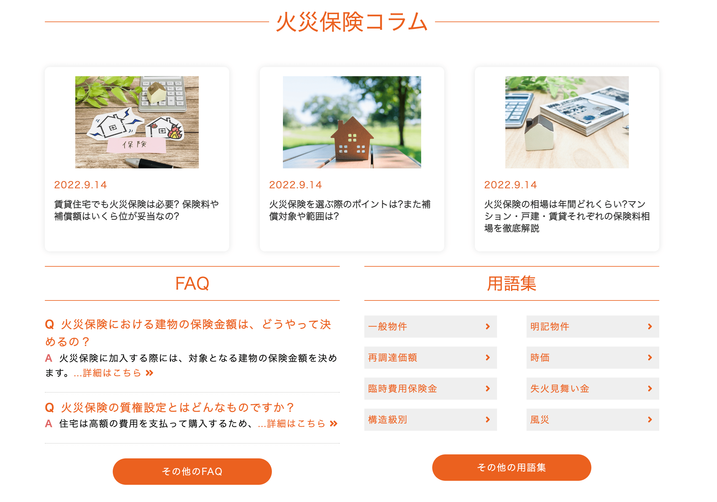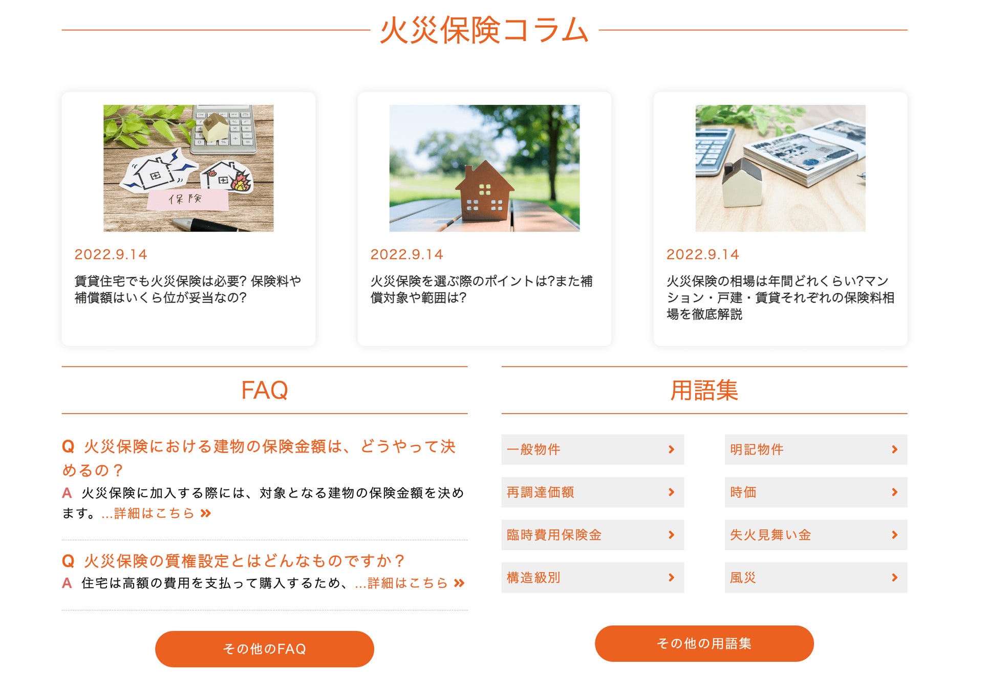 火災保険についてのコラムや用語集等のコンテンツが増えて、更に使いやすくなりました。