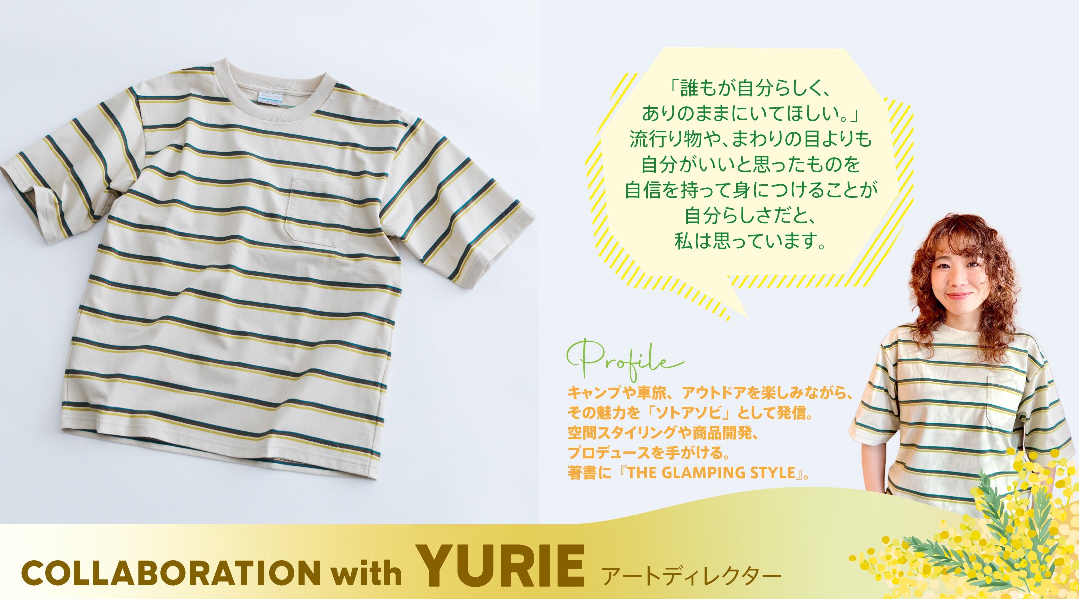 「国際女性デーのシンボル、ミモザ。その花と葉、大地のカラーをボーダーに配置し、デイリー使いしやすいデザインに落とし込みました。『誰もが自分らしく、ありのままにいてほしい。』このボーダーはそんな思いを込めたアイテムになっています。流行り物や、まわりの目よりも自分がいいと思ったものを、自信を持って身につけることが、自分らしさだと私は思っています。胸元のパッチポケットには切花を差してブローチっぽくしてみたり。自由に楽しんでもらいたい。そんなTシャツです。」