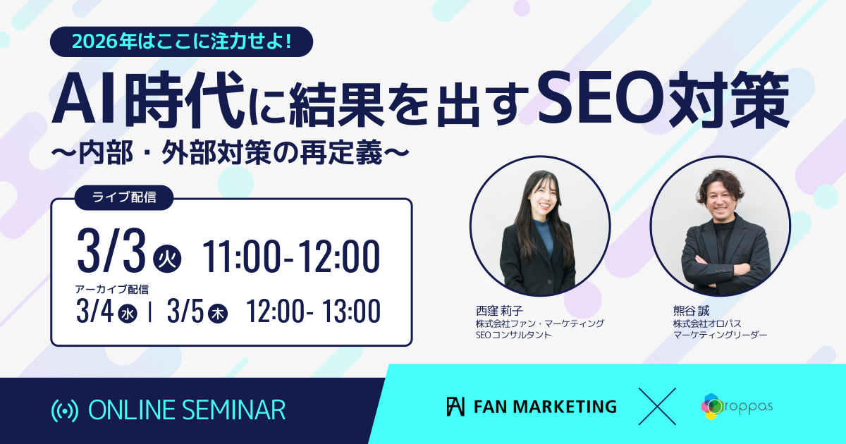 SEOツール「パスカル」の開発・提供を行う株式会社オロパスは、2026年3月3日(火)に、株式会社ファン・マーケティングさまとの共催で、オンラインウェビナー「2026年はここに注力せよ!AI時代に結果を出すSEO対策〜内部・外部対策の再定義〜」を開催いたします。