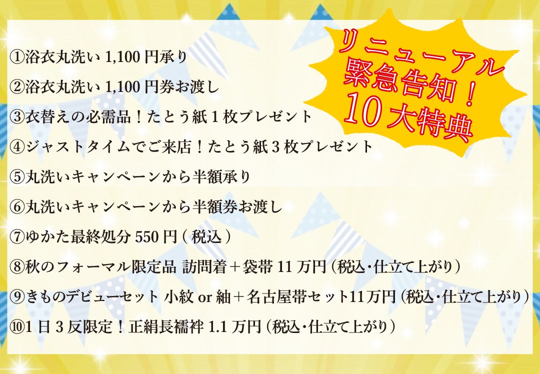 リニューアル記念として2023年8月25日(金)~8月28日(月)の期間、「ほんまもん〜匠〜リニューアルオープン祭」の開催が決定しました。ブランド着物などの特別展示・販売だけでなく、この期間ならではの10大特典、プレゼント企画をご用意しましたので、ぜひ足をお運びください。