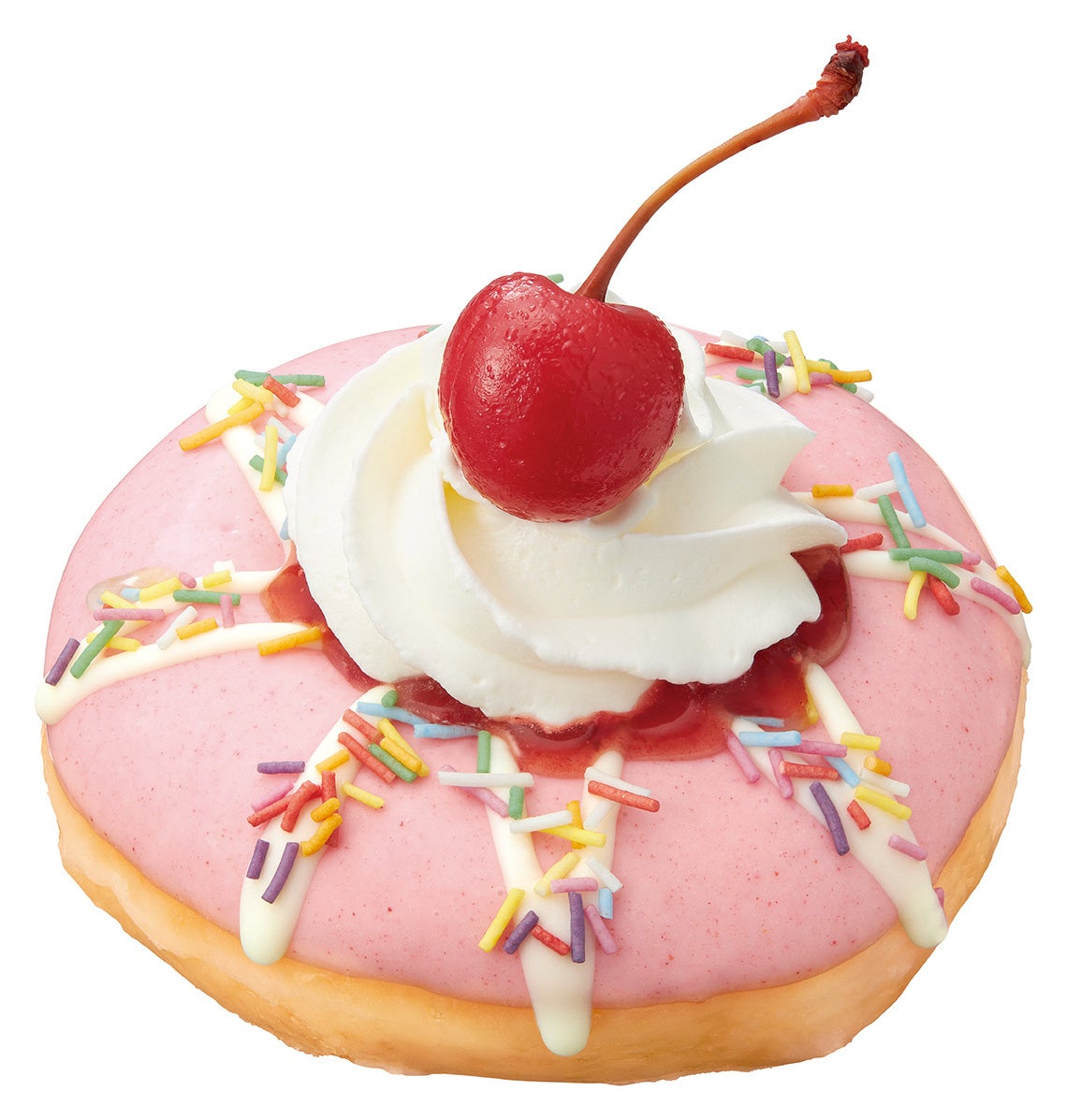 開店1周年を記念し登場する『クリスピー・クリーム・プレミアム 東京 1st アニバーサリー』は、東京国際フォーラム店のストアマネジャー(店長)のアイディアを元に開発したドーナツです。世界中のクリスピー・クリーム・ドーナツで1番人気の「オリジナル・グレーズド®」をベースに、華やかなデコレーションを施し、バースデーケーキのようなワクワク感のあるドーナツに仕上げました。ふわっと軽い生地にストロベリーチョコを重ね、ホワイトチョコでラインを描き、ポップな見た目とパリッとした食感が楽しい7色のスプリンクルをトッピング。甘酸っぱい果肉入りのストロベリーソースの上に、ホイップクリームチェリーで彩りを添えています。