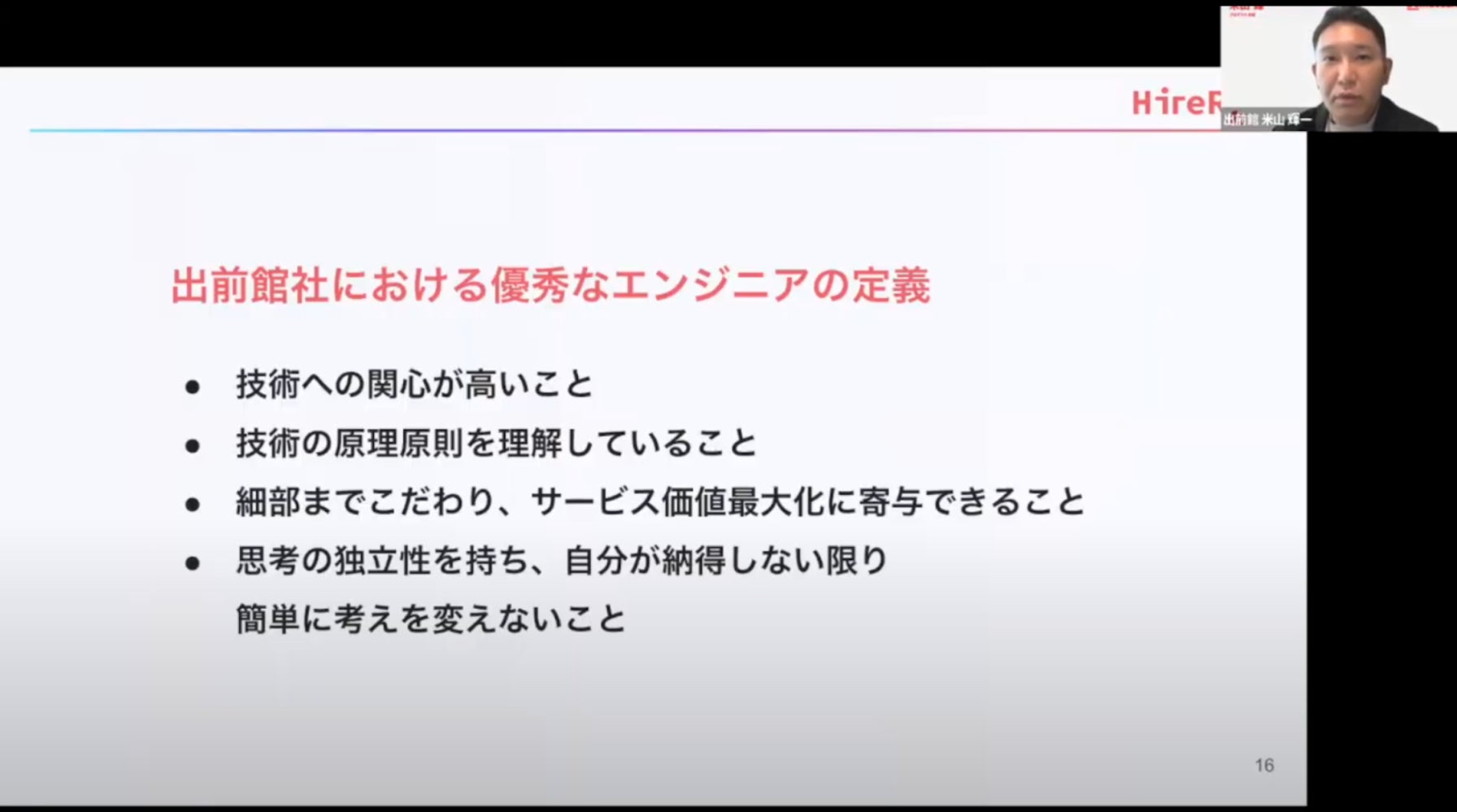 本イベントは、株式会社出前館 執行役員 IT本部長 兼 VPoE 米山輝一氏をゲストに実施。エンドユーザーが利用する「コンシューマ」、配達員が利用する「デリバリー」、加盟店が利用する「マーチャント」の3つの領域がそれぞれが連携する大規模なシステムを開発を行う同社と、ハイヤールー 代表取締役 葛岡 宏祐が、優秀なエンジニアの定義とその見極めポイント、選考プロセスの具体例などをお話ししました。
