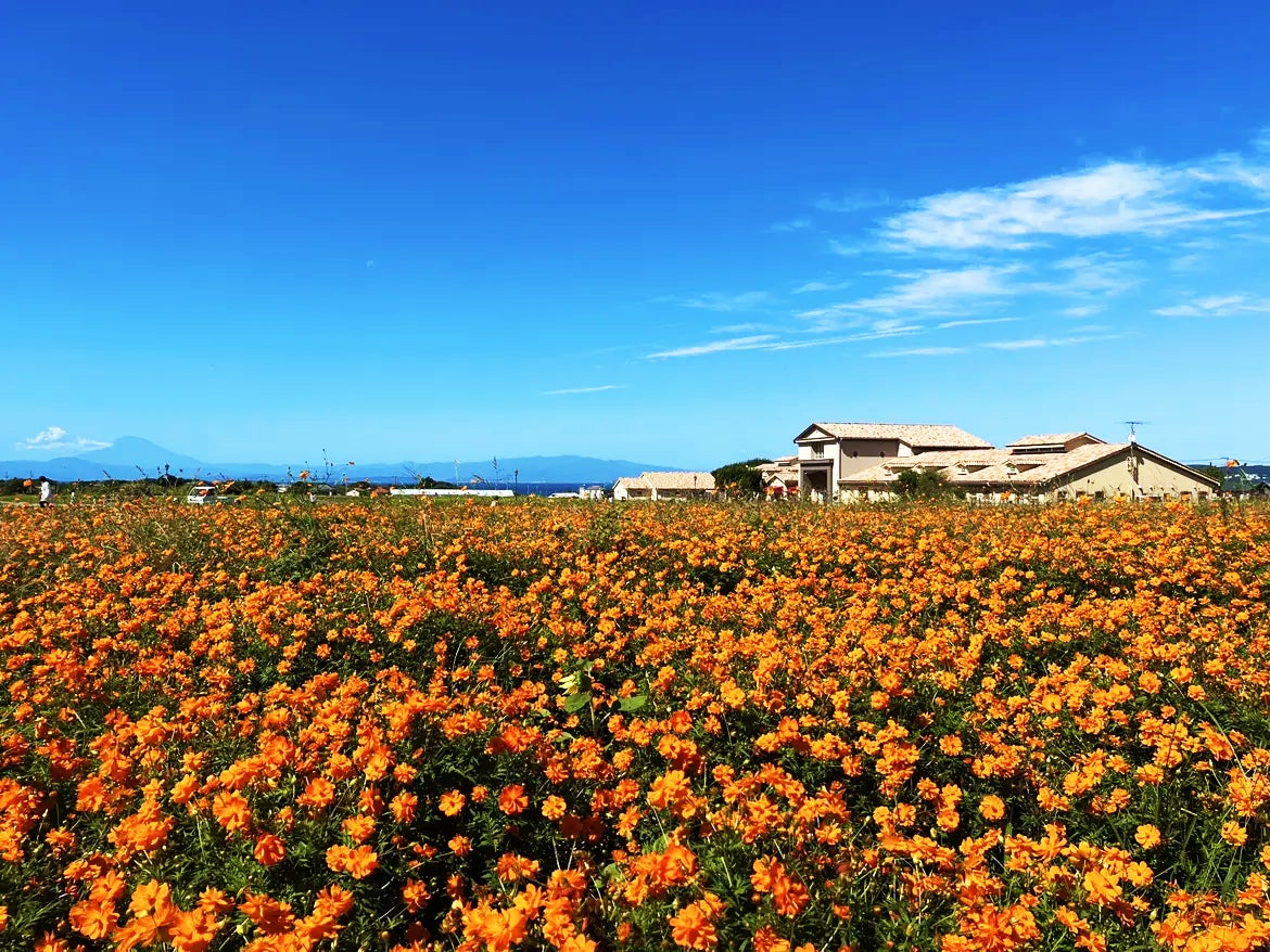 10月下旬からはオレンジ色と黄色のキバナコスモスと、ピンクと白色のコスモスが同時に見頃を迎え、一面に美しい景色が広がります。天候によっては、富士山を望むコスモスの絶景が楽しめます。