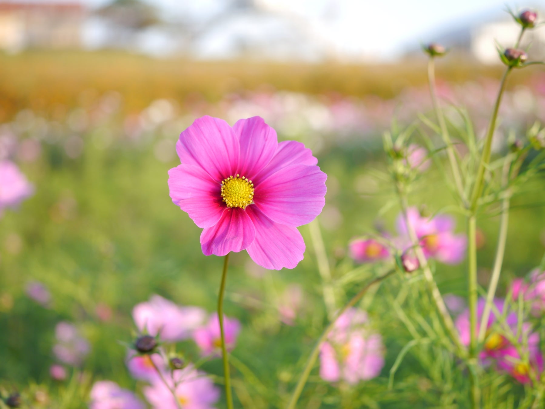 特徴:キバナコスモスより背が高く、ピンク色と白色が混ざった一重の大輪系コスモス。