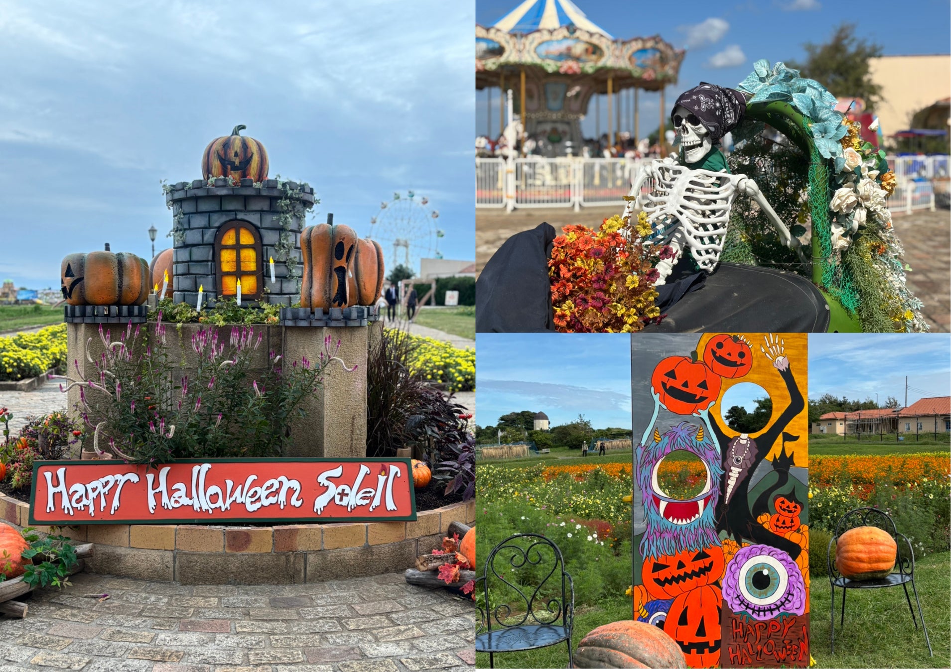 また、現在、園内各所にはハロウィン気分を盛り上げる装飾や期間限定のフォトスポットが登場中。ソレイユの丘全体がハロウィンムードに包まれています。この時期にしか見られない可憐なコスモスとちょっと不気味で愉快なハロウィンの共演をお楽しみください。