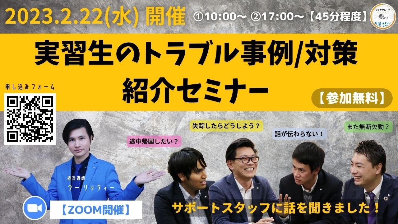 【2月22日開催】「実習生のトラブル事例/対策紹介セミナー」技能実習生の受入れを検討されている方、トラブルの回避方法を知りたい方におすすめのオンラインセミナーを開催します!