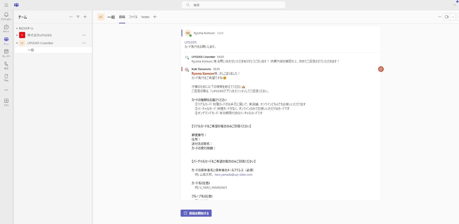 今回、Microsoft Teams 連携への対応開始により、社内のコミュニケーションツールとしてMicrosoft Teams を利用するユーザーが、UPSIDER Coworkerを用いて、UPSIDERのカード制御に関する業務を、AIと人により一部自動化することが可能となります。