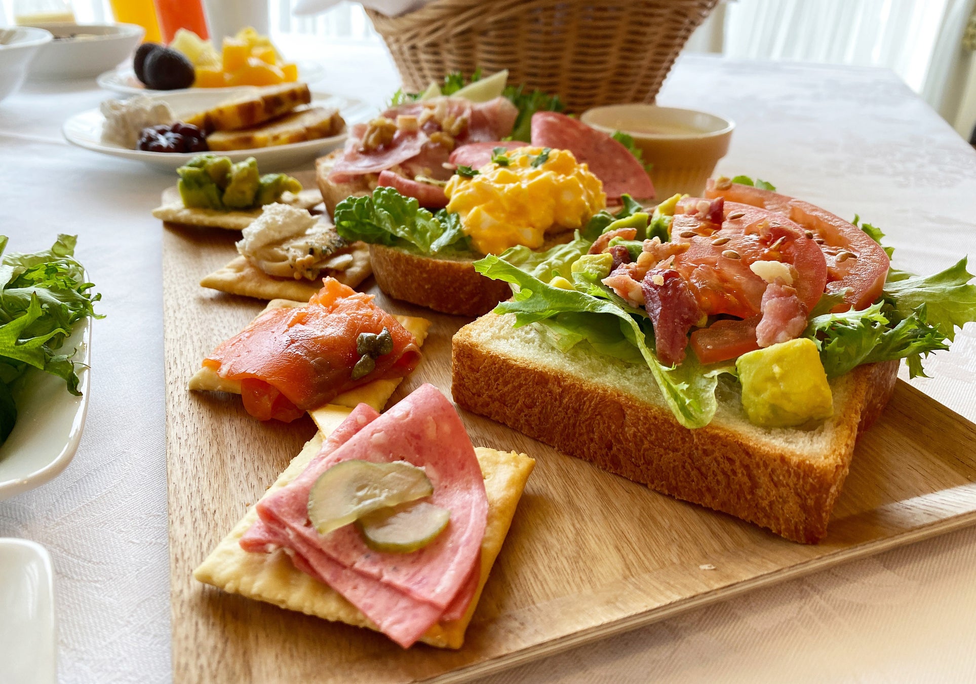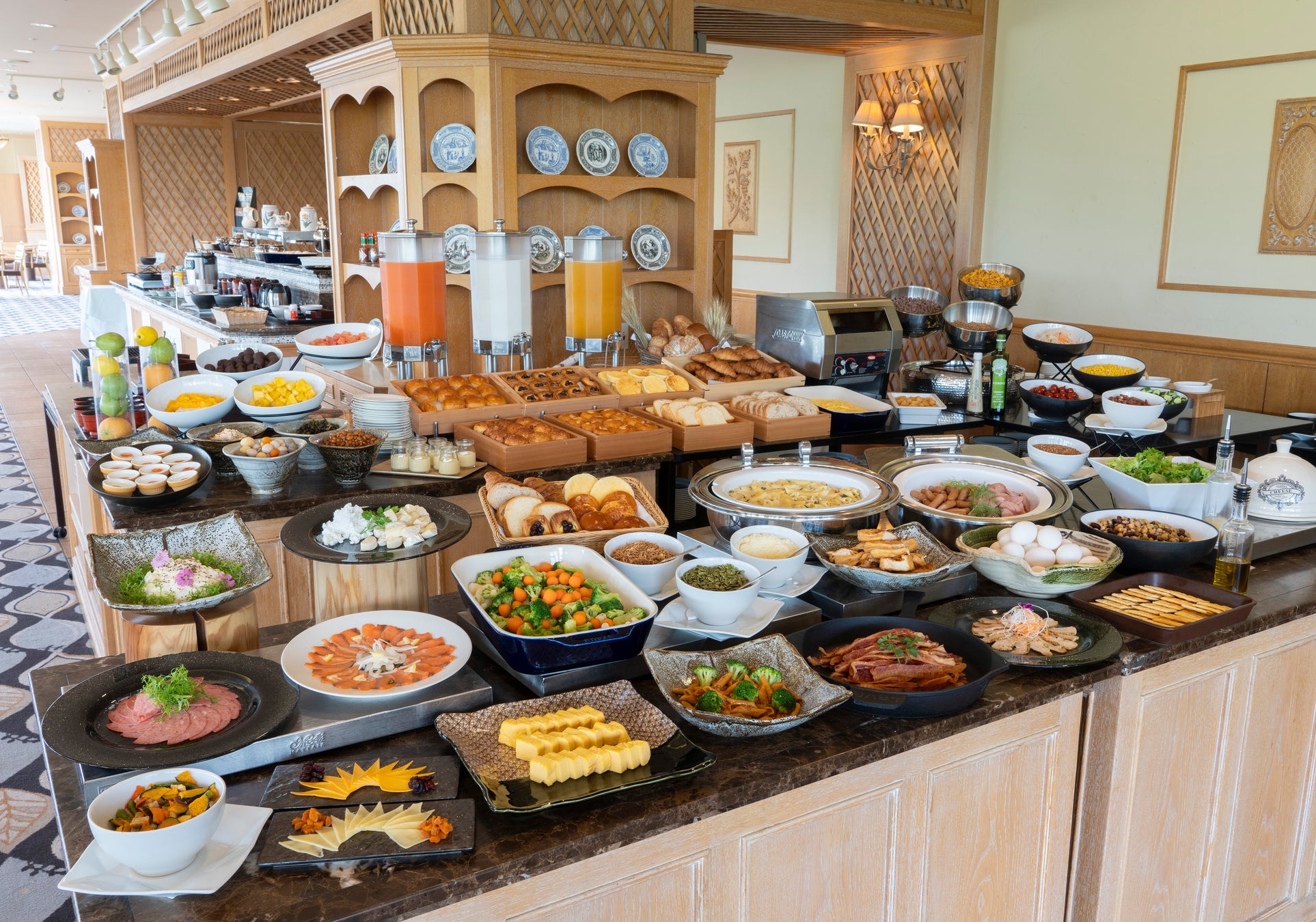ご朝食もレストラン『ロジェール』にて朝食ブッフェをご用意いたします。飛騨産の食材を使ったアソシアならではのメニューに加えて、8種類の自家製パンとトッピングを使ったオープンサンドを作るのも人気です。100種類以上のアイテムを使って自由自在にご朝食をお楽しみください。