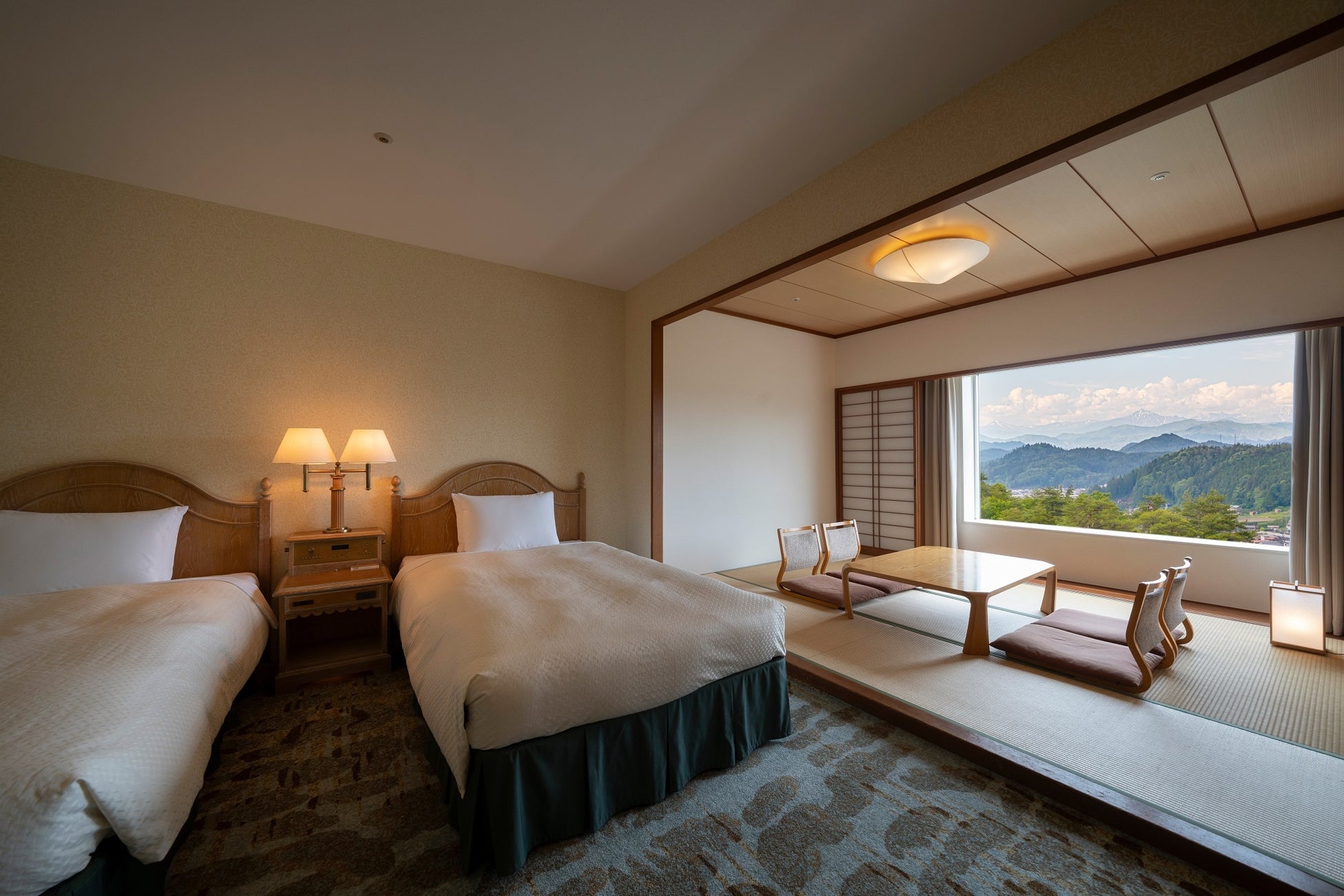 35平米以上の広々とした客室全てから北アルプスを一望できる。