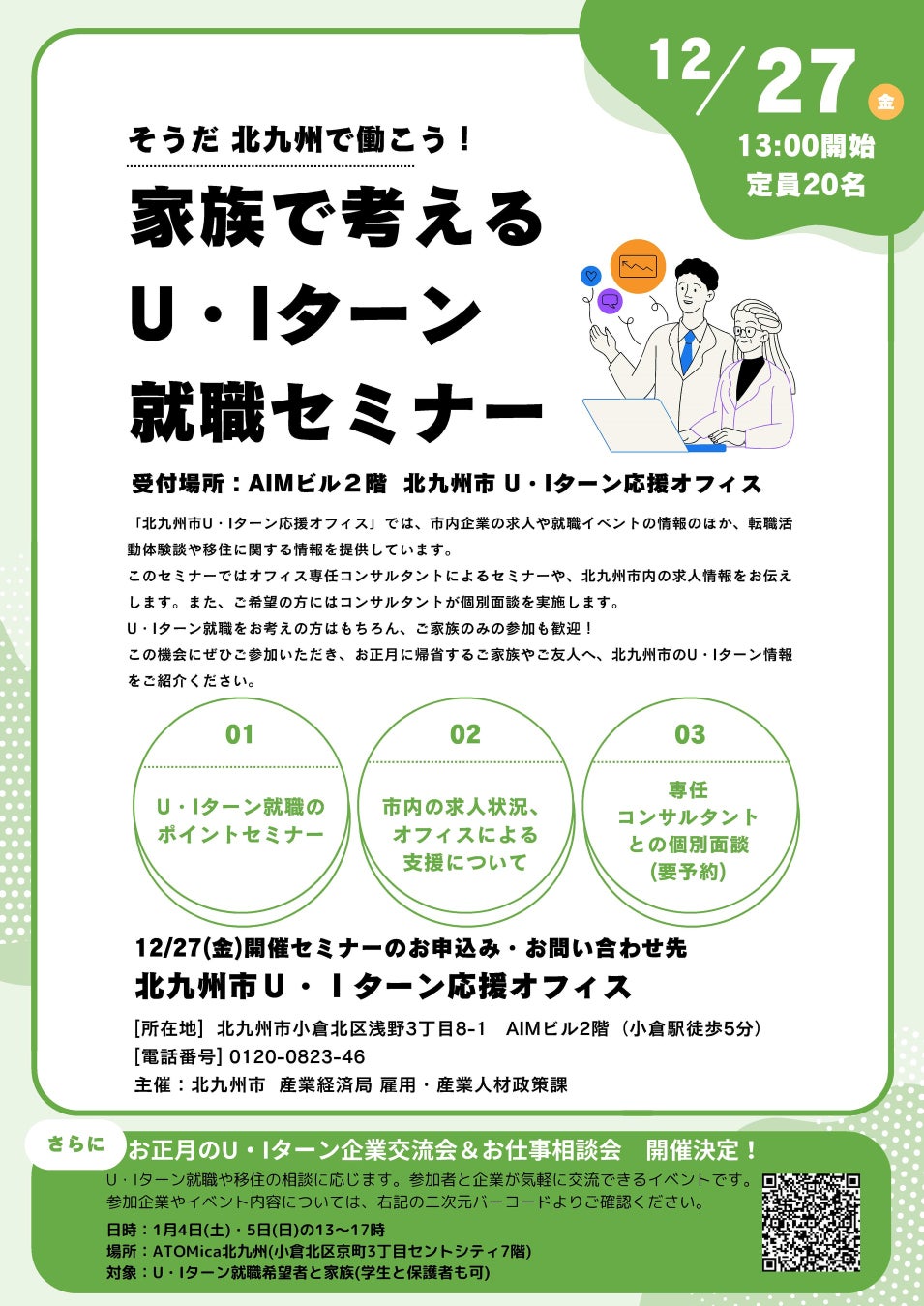 また、令和7年1月4日(土)、5日(日)にATOMica北九州でU・Iターン希望者向けの企業交流会と就職相談会を開催します。
