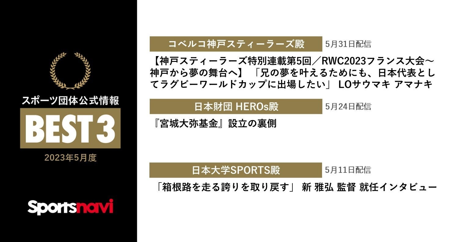 スポーツナビでは毎月、公式情報記事・動画配信において最も印象的だった記事・動画3つを選定し、「スポーツ団体公式記事・動画 月間ベスト3」と称して表彰させていただいております。