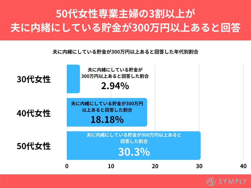 【50代女性専業主婦の3割以上が夫に内緒にしている貯金が300万円以上あると回答】