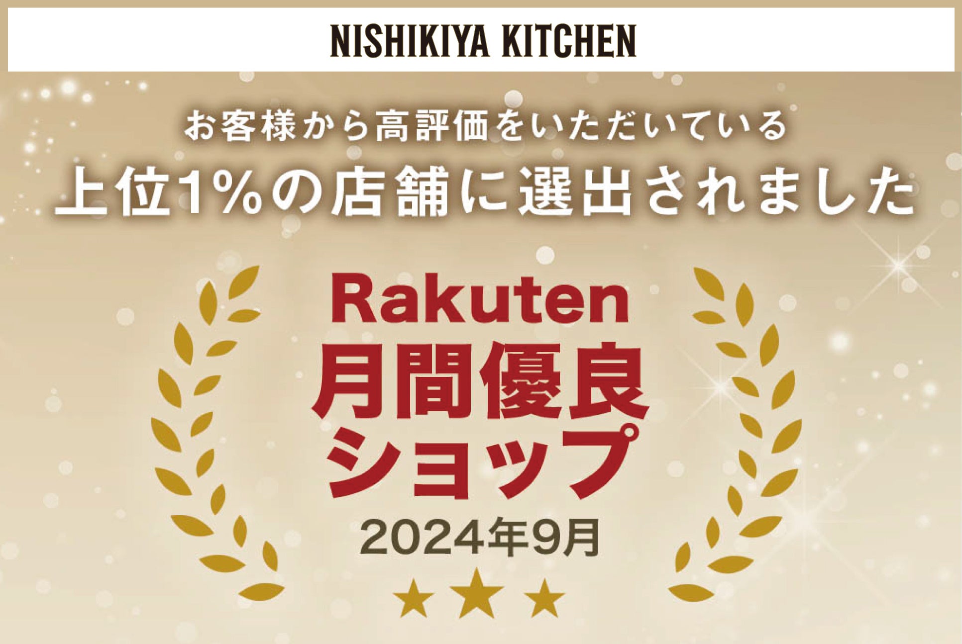 楽天市場に出店している約 57,000 店舗の中から、お客様から高い評価を得た上位 1%の店舗が月間優良ショップとして毎月選出されます。ショップレビューの平均評価・件数、店舗チェックシートの「店舗都合キャンセルの少なさ」「低商品レビューの少なさ」「ユーザクレームの少なさ」などから、ジャンル傾向なども加味して選出されるもので、ニシキヤキッチンは2024年1月度以来、2度目の受賞です。