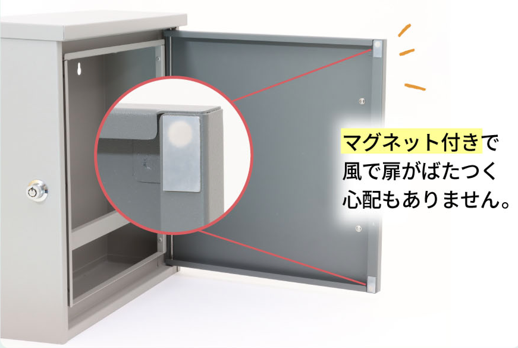 前面には大きく開く取り出し口が設けられており、大きな投函物の取り出しも楽にできます。また、取り出し口には落下防止バーが装備されているので扉を開けた際に投函物が落ちる心配もありません。