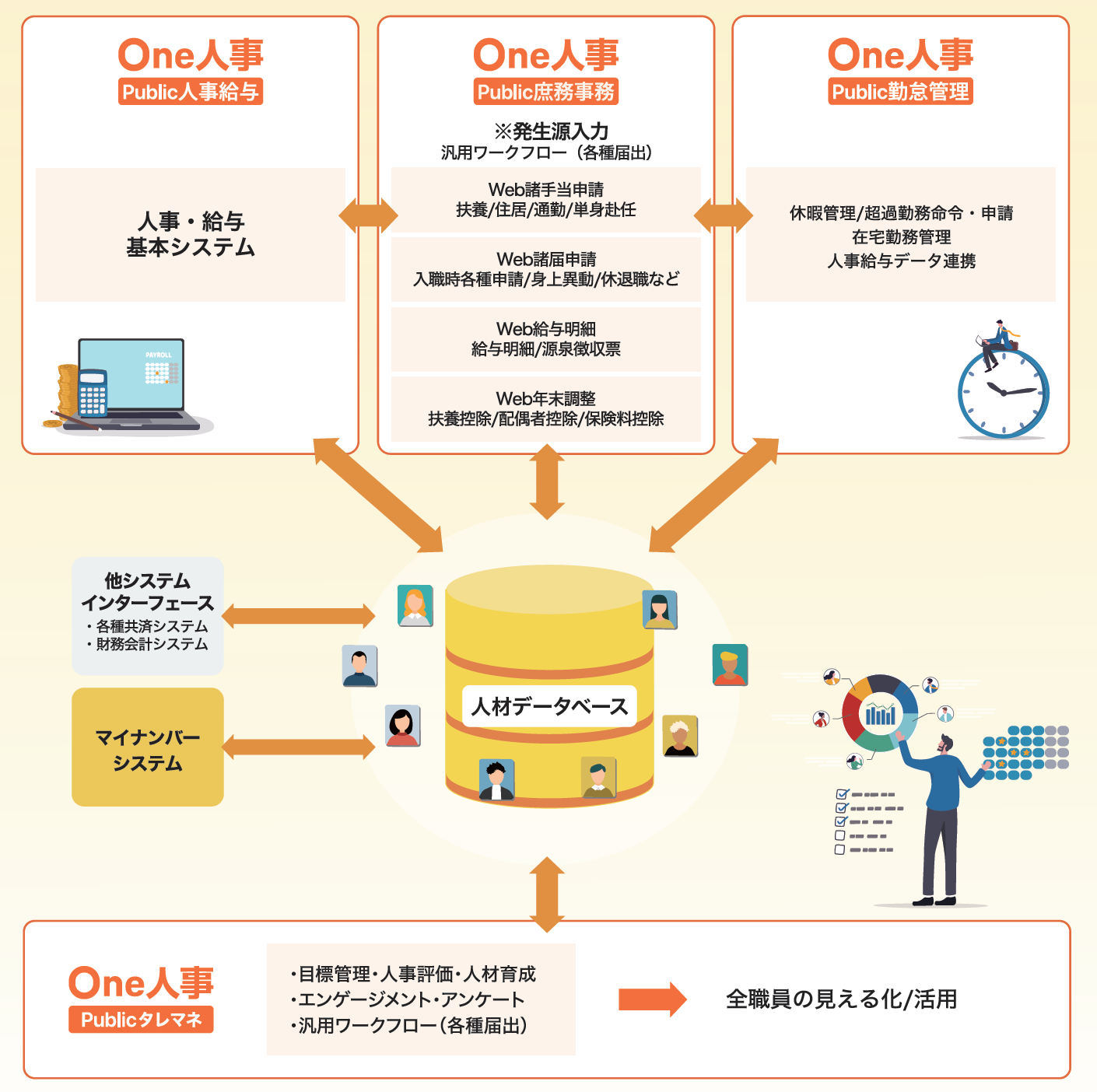 公的機関が必要とする人事給与・人材マネジメント・労務管理の全ての業務を包含する、ワンストップDXソリューションです。