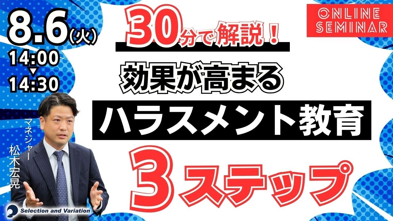 【30分で解説】効果が高まるハラスメント教育3ステップ【8月6日(火)14:00〜14:30】