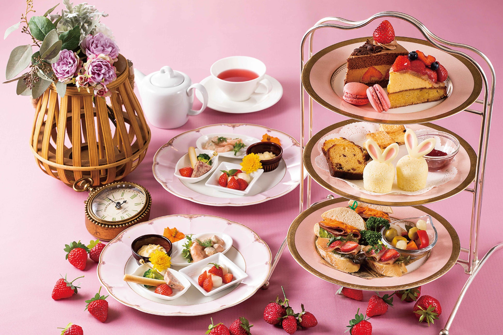 また、スイーツだけでなく、前菜・軽食にもいちごを使用し、いちごとモッツァレラのカプレーゼやいちごと生ハムのオープンサンドのほか、今年の干支にちなみ、うさぎの耳が可愛らしい蒸しパンケーキをはじめ、焼き菓子にはスコーンやパウンドケーキなどお楽しみいただけます。お飲物は紅茶、ハーブティー(7種)、コーヒーが2時間お替わり自由になっており、優雅な時間をゆっくりとお過ごしいただけます。