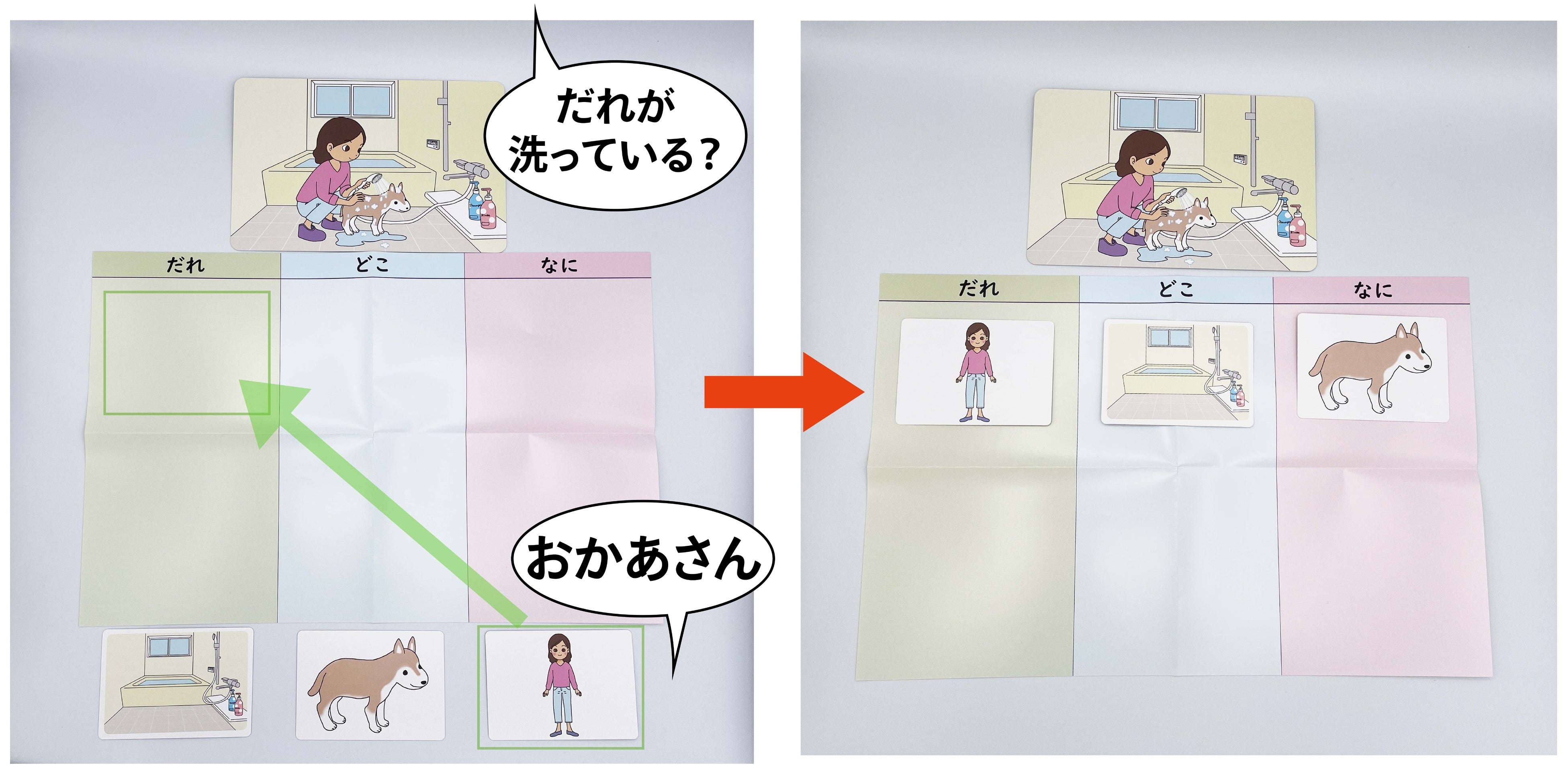 【場面カード】の中の人物を指差しながら、「だれが〜している?(写真の例ならだれが洗っている?)」と質問します。「おかあさん」と答えさせながら、おかあさんの【だれカード】をシートの「だれ欄」に置かせます。
