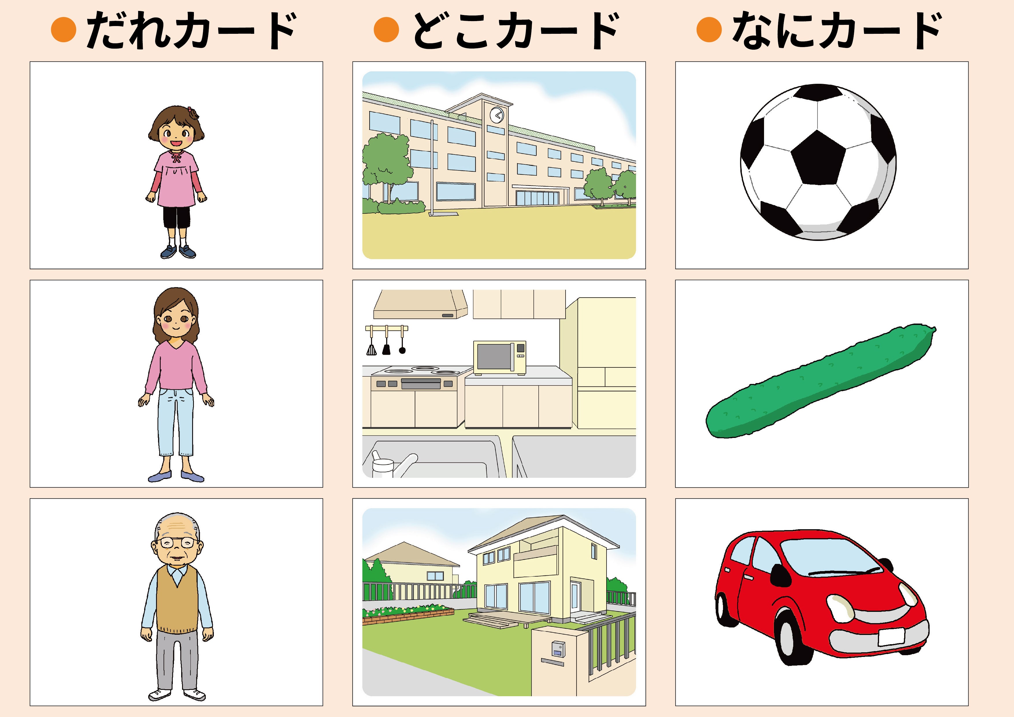 【だれ・どこ・なにシート】を机の上に置きます。【だれカード】【どこカード】【なにカード】を1枚ずつ