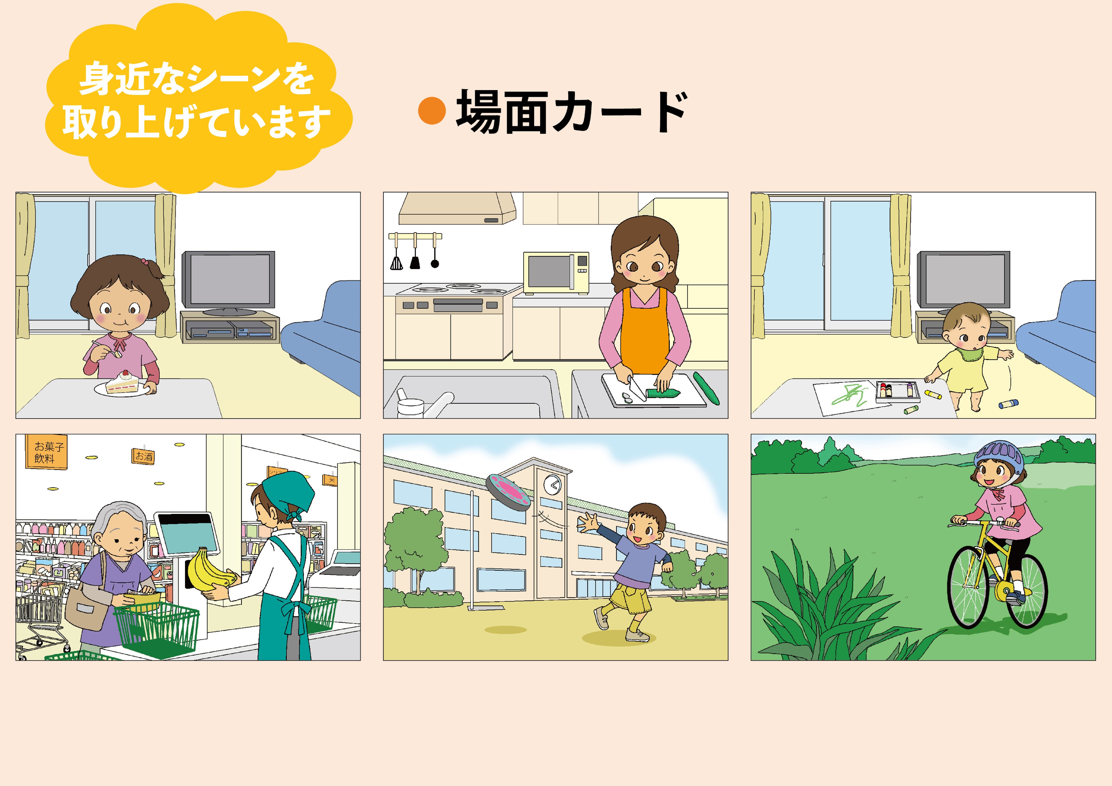 視覚的なヒントを取り去って、【場面カード】だけを見せて質問し、言葉で答えさせます。音声だけで疑問詞に答えることを目指します。慣れてきたら、質問の順番をランダムにしましょう。