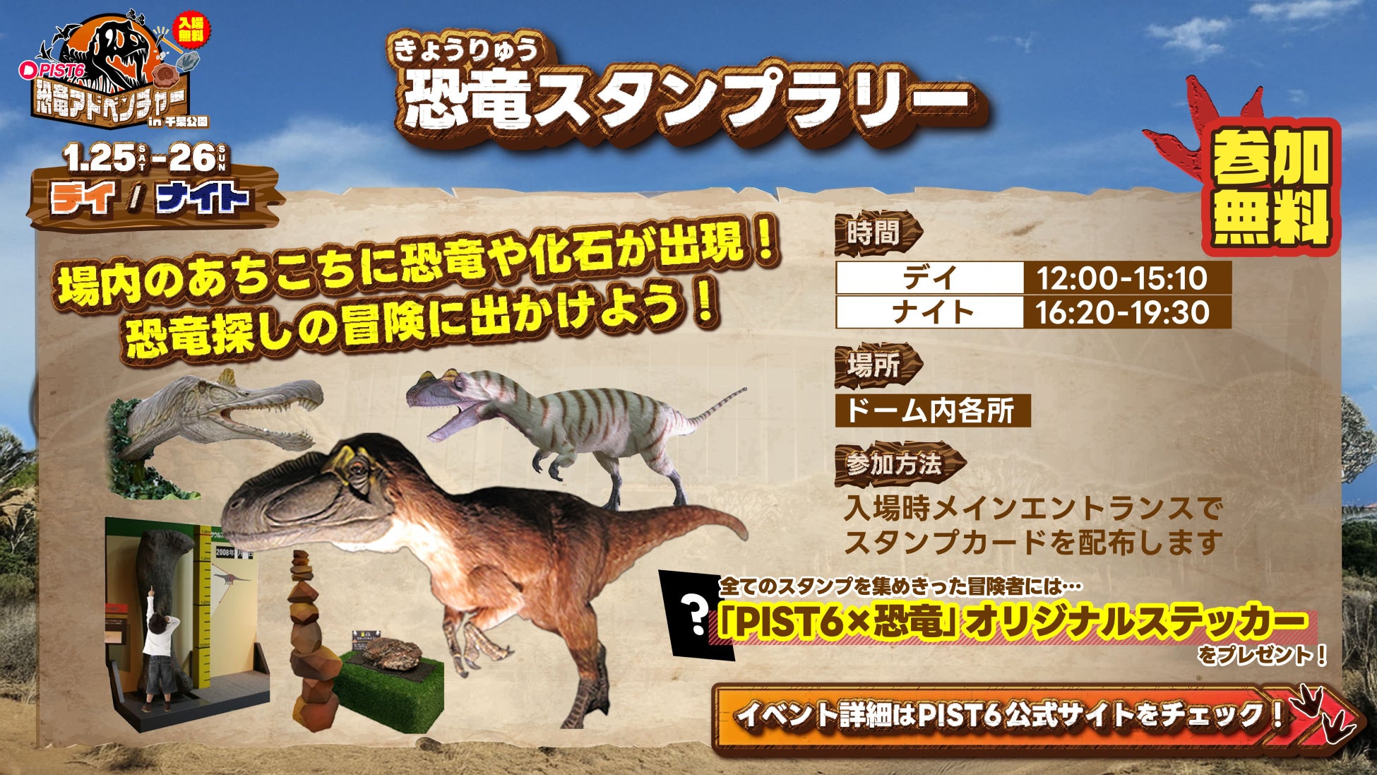 『PIST6恐竜アドベンチャーin千葉公園』は千葉市主催の新しいスポーツエンターテイメントであるPIST6の開催中、会場であるTIPSTAR DOME CHIBA及び千葉公園にかけてで行われる恐竜イベントです。開催は各日二部制で、昼の部(デイ)では「地層ジオラマづくり」や「恐竜工作ブック」などのワークショップ、夜の部(ナイト)では本物の化石を使った「発掘体験」などが行われます。また、全日程共通で「恐竜スタンプラリー」が行われるほか、千葉公園内のTIPSTAR DOME CHIBA前広場では「ティラノサウルスレース」も実施されます。屋内施設の為、天候を気にせずお楽しみいただけるほか(ティラノサウルスレースを除く)、入場無料となっておりますので、ご家族やご友人をお誘いのうえ是非ご来場ください。