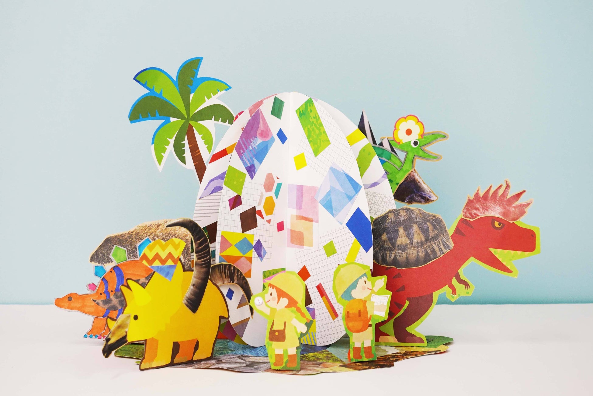 恐竜の卵型のイラストに、お気に入りの恐竜や恐竜のイラストパーツを貼って自分だけの飛び出す絵本を作成できます。