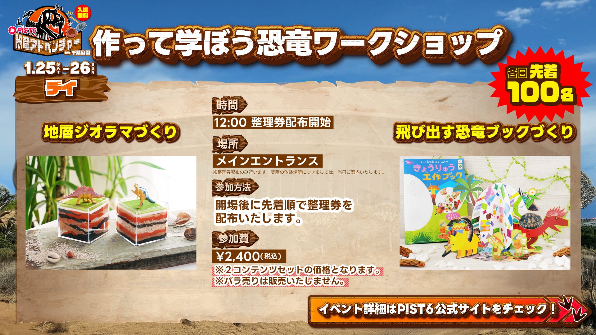 粘土を使い実際に地層の仕組みについて学びながらオシャレなジオラマが作れる「地層ジオラマづくり」に自分の自由に恐竜達を使って世界に1冊だけの工作ブックを作れる「飛び出す恐竜ブックづくり」の2つのワークショップが楽しめます。