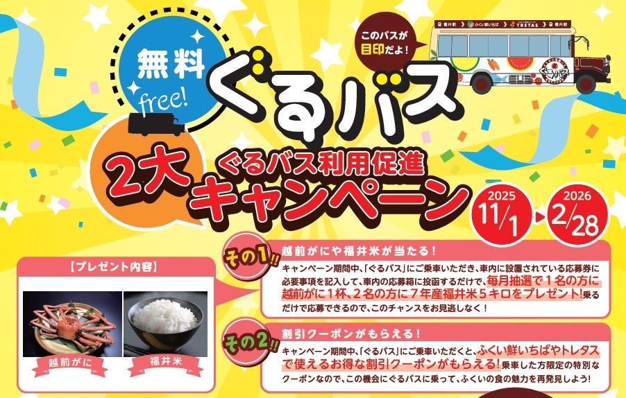 キャンペーン期間中、ぐるバスにご乗車いただき、車内に設置されている応募券に必要事項をご記入の上、降車時に応募箱に投函してください。毎月抽選で1名の方に越前がに1杯、2名の方に令和7年産福井米5キロをプレゼントします。