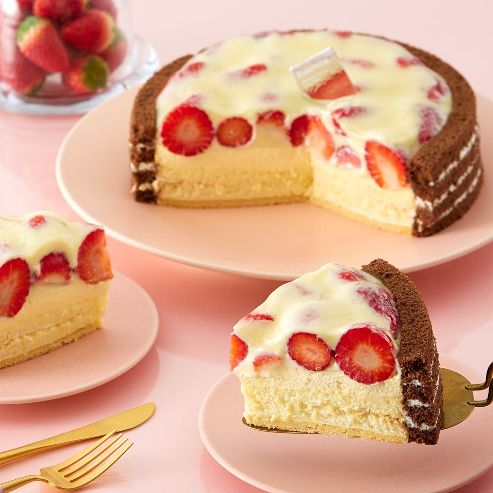 春のおいしいイチゴをまるごとぎっしり敷き詰め、上になめらかな特製カスタードクリームをたっぷり重ね、とろける口どけのババロアとしっとりスポンジ、下にはサクサクのクッキーを敷き、周りをココアスポンジで包みました。イチゴの爽やかさと、ミルキーなババロア、甘さ控えめなやさしい風味のカスタードクリームが口溶けよく広がり、全ての味わいが絶妙な相性で一体となり際立ち、印象的なおいしさを奏でます。
